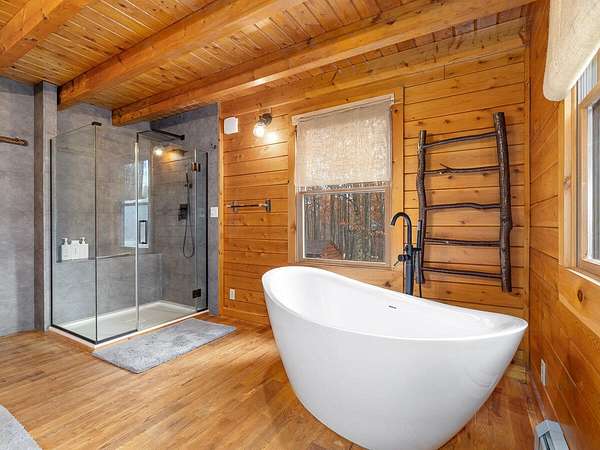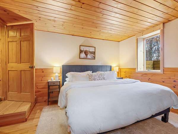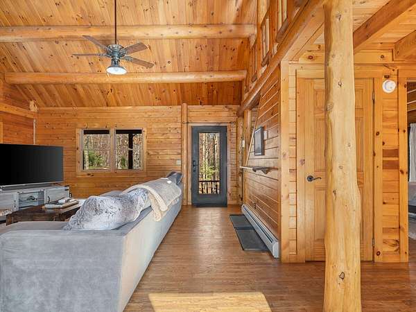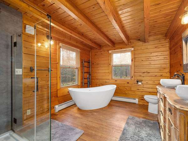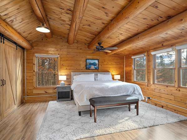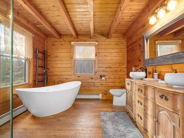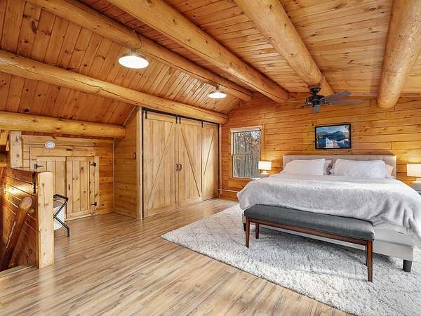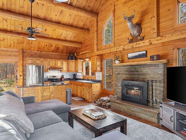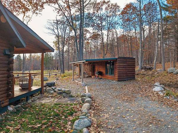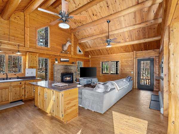 Nestled in a quiet Wilmington neighborhood, this classic Adirondack log cabin blends rustic charm with modern comfort. Spanning 2,200 square feet, the home features 3 bedrooms and 2 bathrooms across three floors, including a luxurious main level bath that offers a spa-like retreat after a day spent skiing or hiking. Large windows fill the open living spaces with natural light, highlighting the rich wood finishes, exposed beams, and cathedral ceilings that create a warm, inviting atmosphere. Enjoy the outdoors year-round with two spacious covered porches. The property also includes a garden shed and a heated workshop, ideal for storing bikes and skis. Set on 5 peaceful acres, this home offers privacy while being just minutes from the heart of Wilmington and Whiteface Ski Resort. Currently a successful vacation rental, the home is being sold completely turnkey-ready for your immediate enjoyment or continued investment. Buyer will need to apply for a short-term rental permit with the Town of Wilmington.