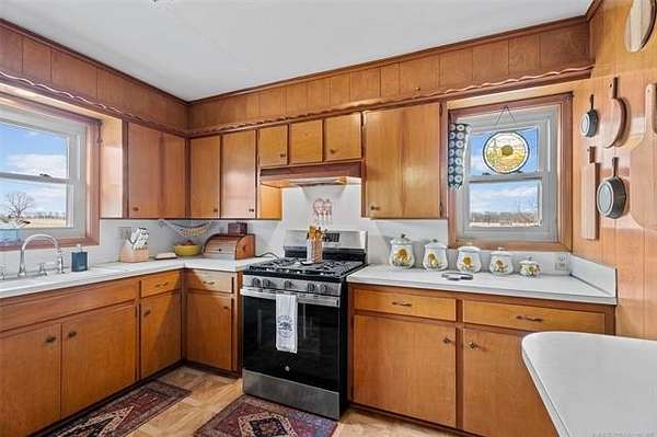 The 3-bedroom, 2-bath home sits on fenced acreage and features distinctive brick walls, warm wood floors, and a mid-century modern feel that sets it apart from typical rural properties. Large windows bring in abundant natural light, and the flexible front living space plus generous utility area create a layout that adapts easily to everyday living.