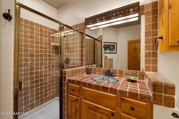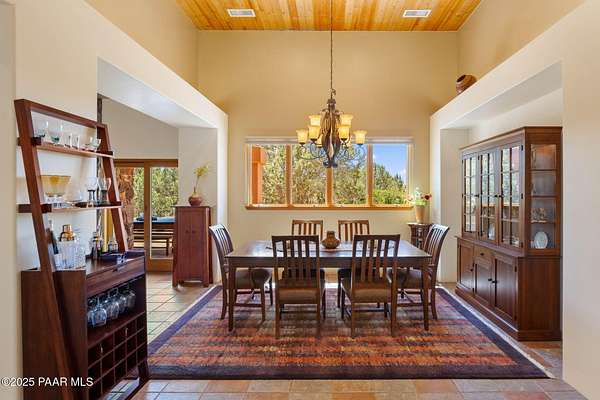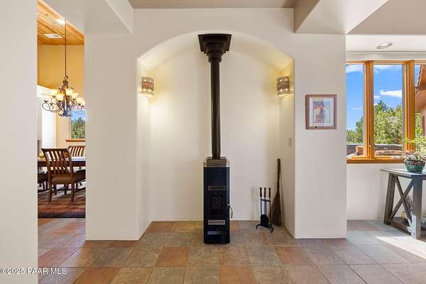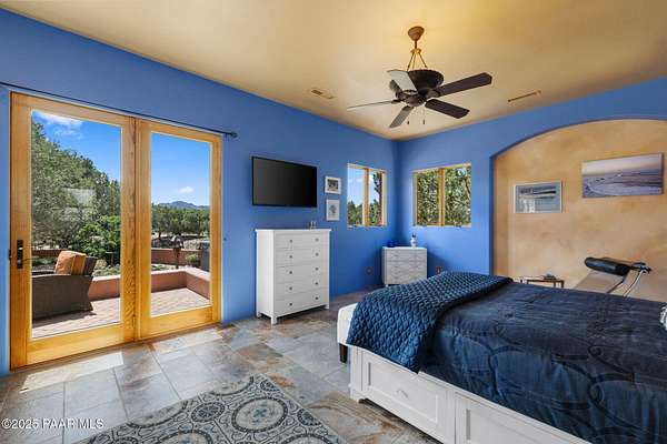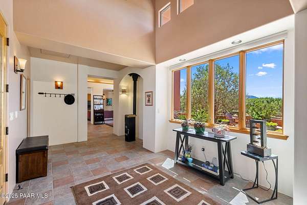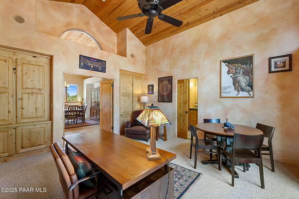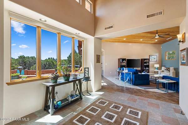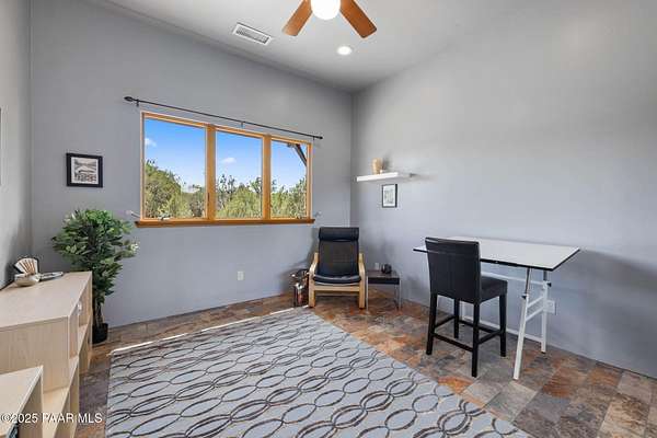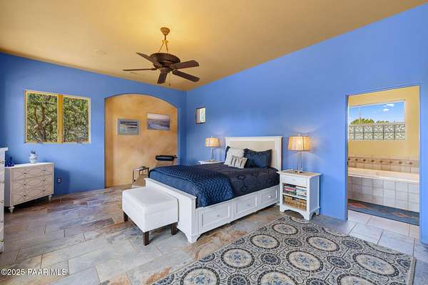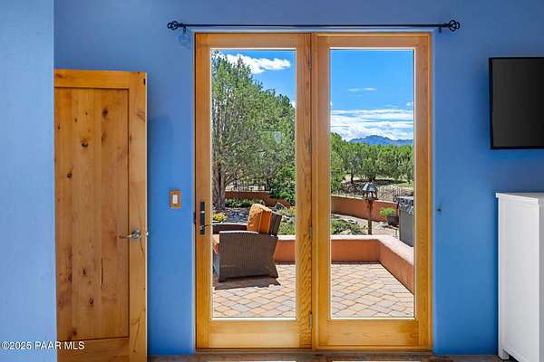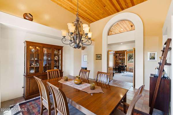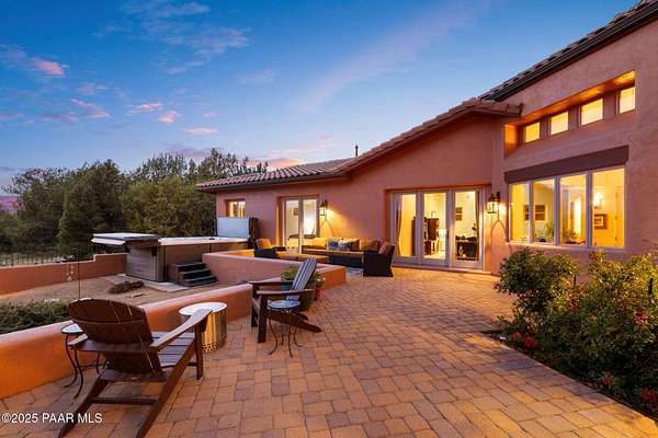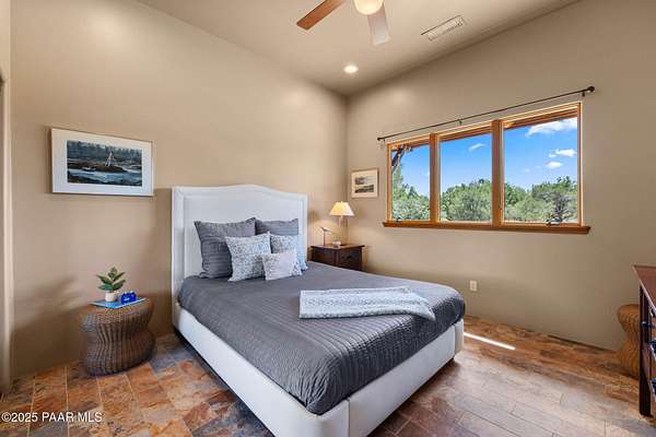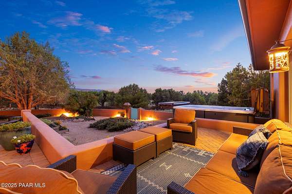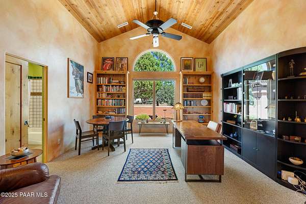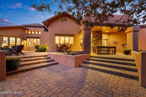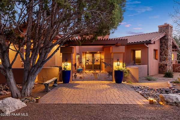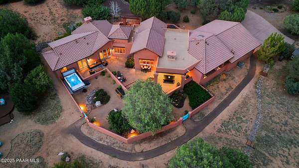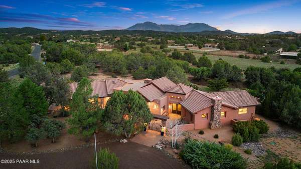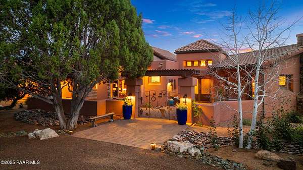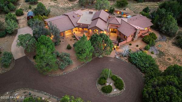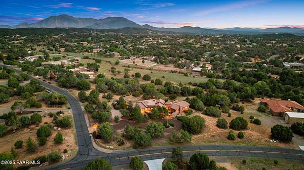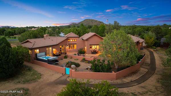 Santa Fe Ranch Oasis on 2.4 Acres | No HOA | 3-Car Garage & RV Parking - Beautifully maintained 3,200 sq ft former model home in desirable Inscription Canyon. Set on a quiet cul-de-sac, this one-level retreat offers Granite Mountain views, mature trees, and trail access. A landscaped front yard, circular driveway, and gated courtyard set a welcoming tone. Inside, a split floor plan provides privacy and flow, with raised ceilings, expansive windows, and custom details. The spacious living room features a gas fireplace, wet bar, and vaulted tongue-and-groove ceiling opening to a large patio through Anderson French doors. The remodeled kitchen showcases Cambria quartz, new stainless appliances, and refinished cabinetry, connecting to a cozy family room and formal dining area. Three bedrooms include a primary suite with mountain views, jetted tub, walk-in closet, and patio access. An oversized den/office with built-ins and attached bath serves as flex space or 4th bedroom. The secluded backyard sanctuary offers a fenced courtyard, partially covered patio, new built-in BBQ, swim spa, and multiple seating areas for sunset dining, entertaining, and stargazing. Exterior highlights include walking paths with bridges, a custom deck, two sheds, oversized 3-car garage with built-ins and workbenches, 30-amp RV hookup, and sunken propane tank. Pre-sale inspection completed with improvements addressed for peace of mind. This gem offers privacy, natural beauty, and timeless Southwestern charm.