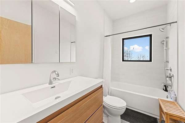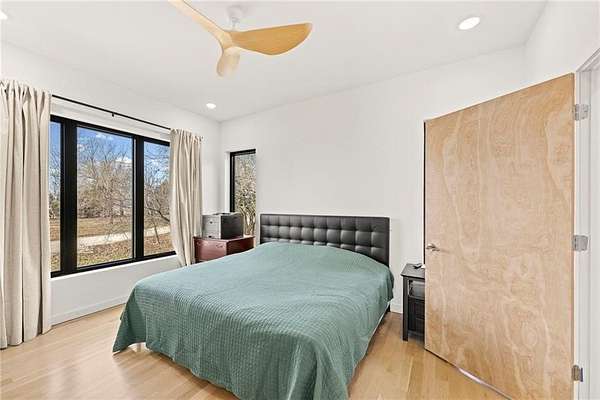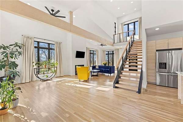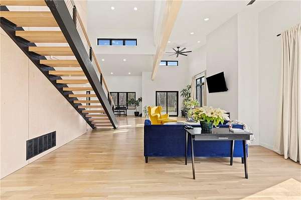 Built for longevity and efficiency, the home features 2x12 floor joists and 2x6 exterior walls, along with expansive dual low-E Pella Impervia insulated windows that flood the interior with natural light. White oak hardwood floors extend throughout the living areas and bedrooms, complemented by a striking floating staircase with thick white oak plank steps.