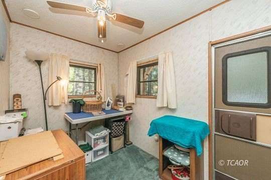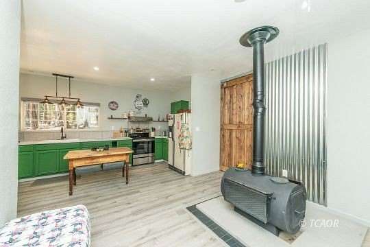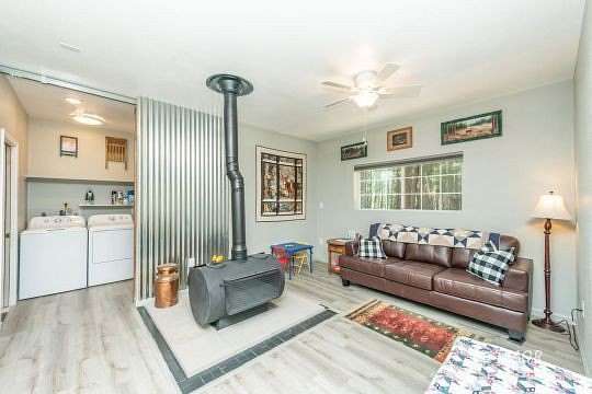 - Laminate/Formica Linoleum/Vinyl, Countertops Laminate, Flooring Carpet, Flooring Guest House, Window Coverings, Ceiling Fan(s), Wood Stove, Flooring