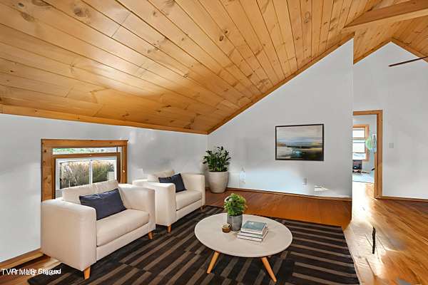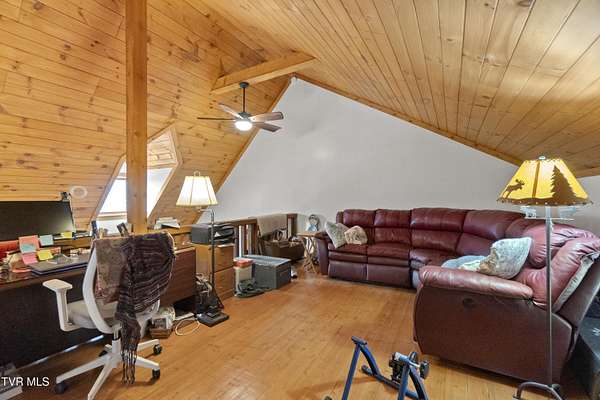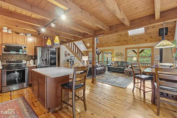 Gorgeous cabin with views of the National Forest, close to Asheville, North Carolina, with the Appalachian Trailhead just down the road. This cabin has hardwood flooring throughout. The main great room features a tongue-and-groove ceiling, skylight, and a wood stove. The kitchen was renovated in 2020 and features soft-close cabinets and drawers, high-end stainless appliances, recycled glass quartz countertops and island top, high-end Pella windows and doors, a retractable screen door, and designer hinged glass panels. The home also has solid wood interior doors throughout. The property includes a Hearthstone soapstone wood stove, new in 2020, and the chimney was serviced in 2025. The 3.5-ton heat pump was installed in 2023, a mini-split system was added in 2024, and all roof screws were replaced in 2023. The second level features a great living area with loft space and tongue-and-groove vaulted ceilings, along with the primary suite offering double closets and a private bath. There is extensive decking, including a side deck with a hot tub. Additional features include a one-car drive-under basement garage. In 2023, the driveway was redone with guardrails and stone. A new 50-gallon water heater was installed in 2020, and the septic tank was pumped the same year. The septic system is designed for a two-bedroom home. The entire deck was replaced in 2015. Schedule a showing for this great cabin property today! Investor looking for 2 homes? Adjacent home also for sale. All information taken from a third-party source (courthouse/tax records) and to be verified by the buyer/buyer's agent. Drawn in lines are approximate. Some elements (fires in fireplaces, twilight shading, lighting, etc.) have been added/modified digitally. Rooms noted have been virtually staged for decorating ideas only, not to scale or representative of any product.
