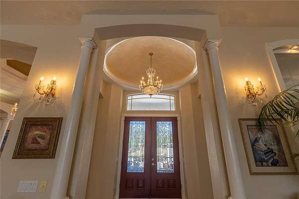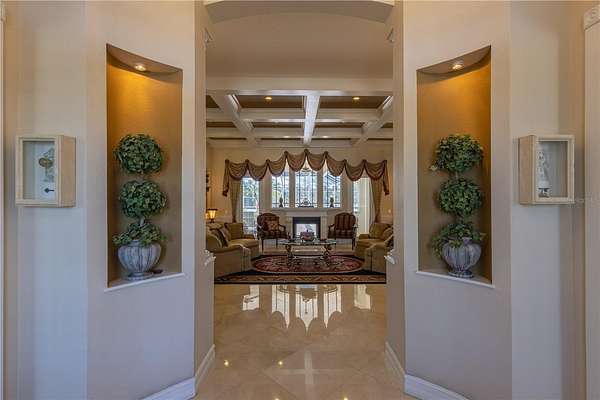 A dramatic formal entry welcomes you with polished travertine marble floors, soaring 12' coffered and inlaid wood-beam ceilings, and a striking double-sided fireplace. To the right, the formal dining room is anchored by a radiant crystal chandelier; to the left, an impressive executive office offers a quiet retreat.
