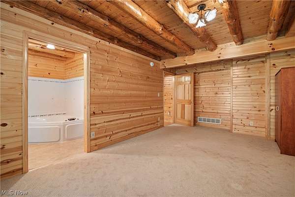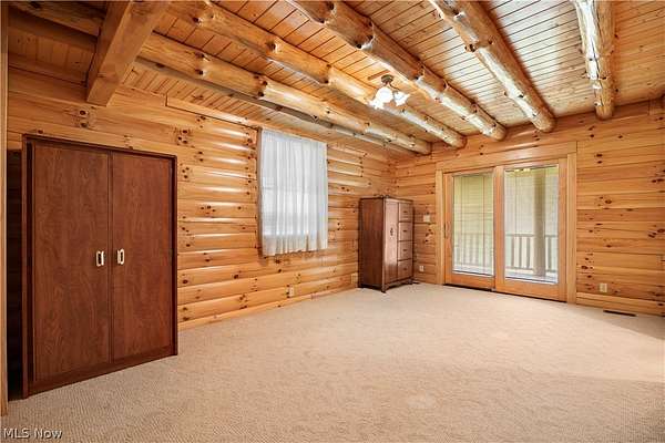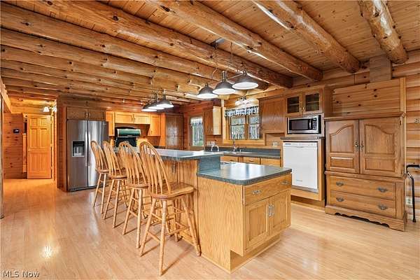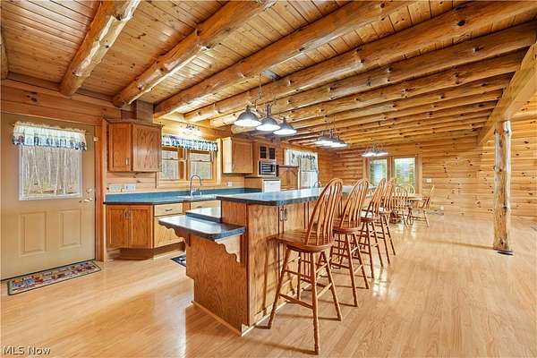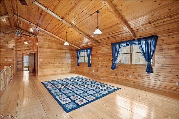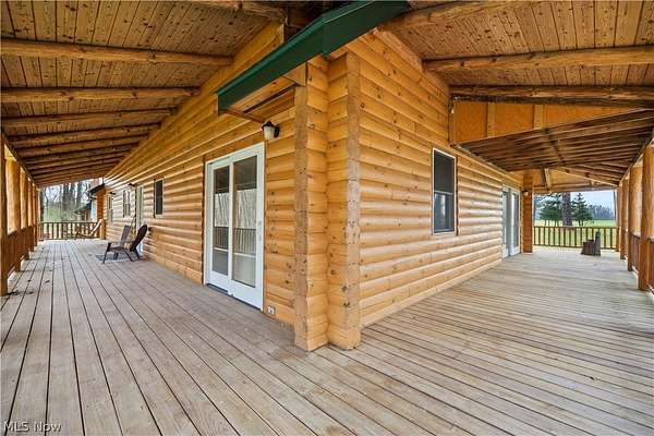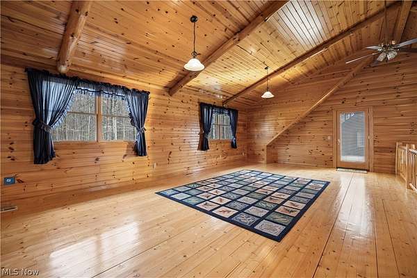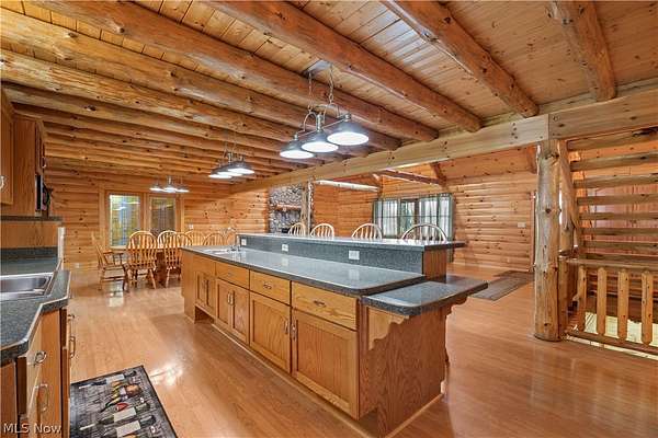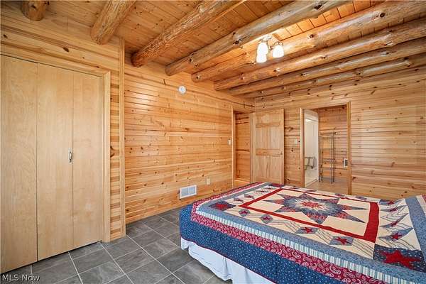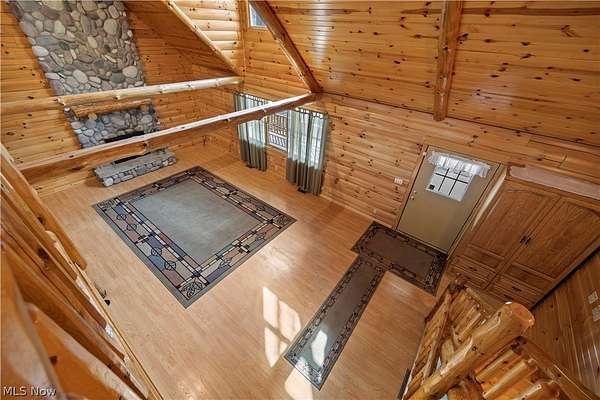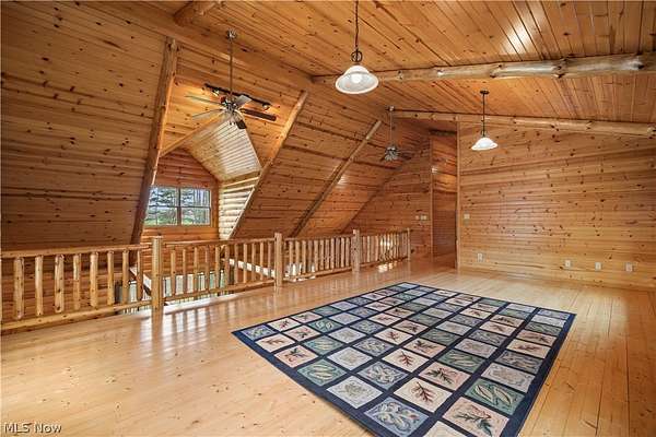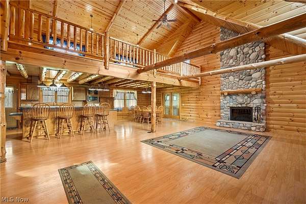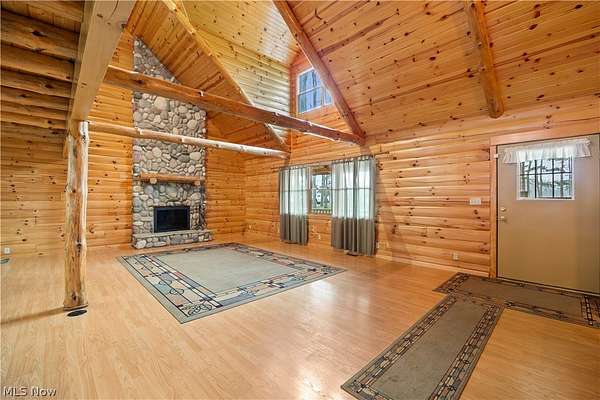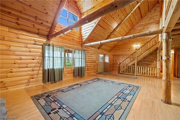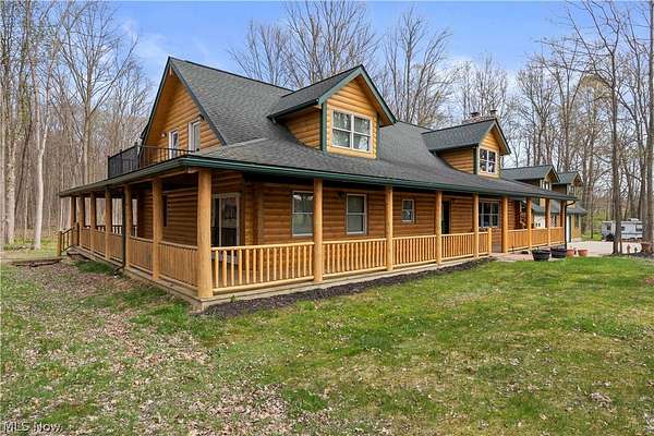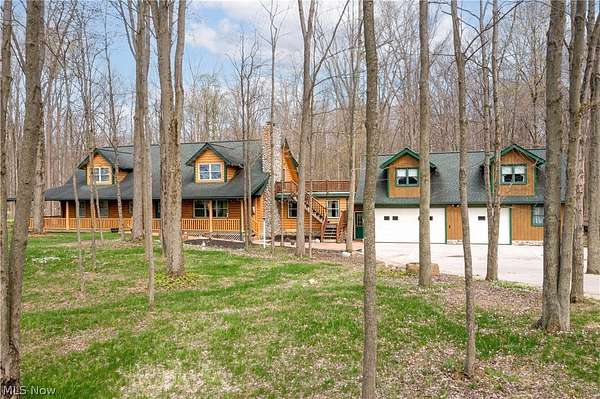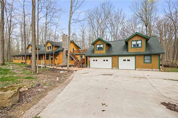 Welcome to 13719 Garfield Rd - a stunning Amish-built log cabin nestled in Wakeman, Ohio, Florence Township. This extraordinary 3,600+ sqft home features 5 bedrooms and 5.5 bathrooms, including four luxurious bedroom suites with full baths. The breathtaking open living room boasts soaring vaulted ceilings tall enough for an 18-foot Christmas tree, anchored by a custom stone fireplace with a dramatic loft overlooking the space. Enjoy the wraparound porch and expansive 21x21 balcony for peaceful countryside views. A full basement adds tremendous storage space and indoor shop, that could be finished. There is a second stairwell that leads from the basement to a large flex area between the garage and house that has its own heat/cool pump. Geothermal heating and cooing. A heated 3.5-car garage with a full bathroom offers incredible convenience, while finished rooms above the garage provide a separate apartment - ideal for additional living space. Located in the desirable Firelands School District near Birmingham School MetroPark, this one-of-a-kind retreat delivers rustic elegance at every turn. This home was built as "Cabin in the Woods Bed and Breakfast" and every review mentioned how Beautiful the home and the setting is. The 5.18 Acres is about 1/2 woods with a small brook and quaint wooden bridge. The front yard, approximately 2 acres, has a huge garden area. I could keep going but this place is a must see to believe!