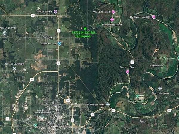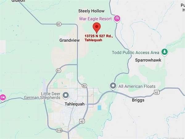From OK-51 Spur at HWY 82S, head North on HWY 82 1.5 miles to Right on E Steely Hollow Road. continue straight at split onto N525 Rd to left on N 527 RD to prop on LSOR
