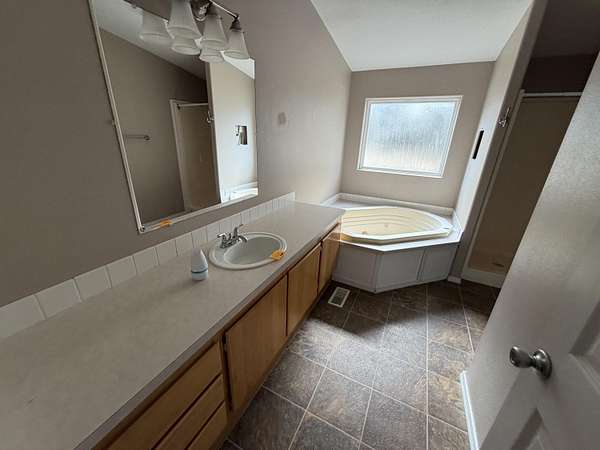 - Laminate Counters, Primary Downstairs, Shower/Tub Combo, Soaking Tub, Vaulted Ceiling(s), Walk-In Closet(s)