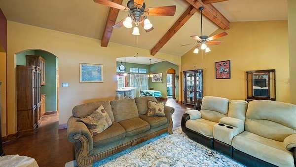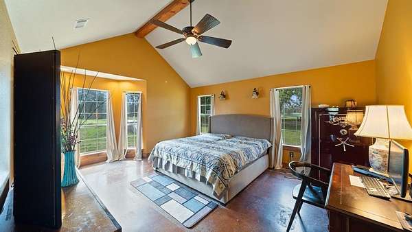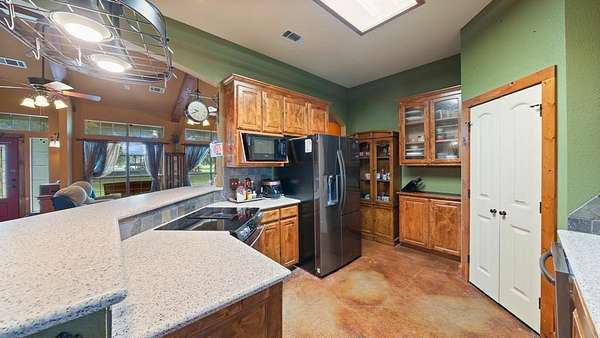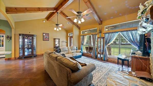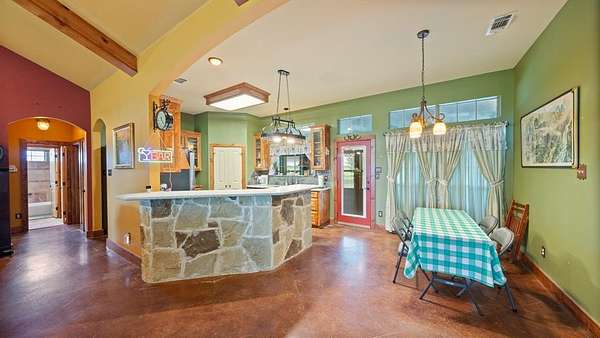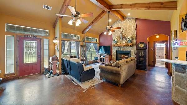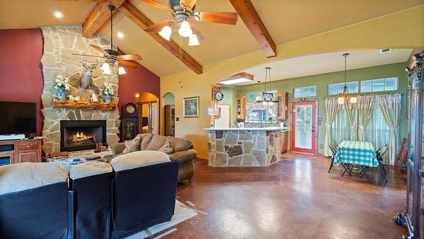 Welcome to your rustic hideaway that's conveniently located approx. 15 minutes from Kaufman and 20 minutes from Canton. This charming 3-bedroom, 2-bath custom home sits on 15.7 Ag exempt, fenced acres with a wrought iron security gate entrance. There are 3 ponds, a riding paddock, and a loafing shed just waiting on you and your farm animals. Both the 30 X 50 workshop & the 24 X 30 garage have foam insulation, electricity, gutters, and overhead doors. The oversized garage even has a breezeway connecting the detached garage to the house. Texas weather can be unpredictable, but no worries, there's also a storm shelter next to the house. Wide open space and an above ground pool and deck, create the perfect combination for entertaining. The open concept floor plan is always an added bonus, making sure you're never left out of what's going on while on kitchen duty. The stained concrete floors and wood beams give the home a wow factor, and the vintage door on the hallway storage adds a touch of shabby chic. The utility room is most definitely user friendly with a sink, folding table, and storage. The bonus room that runs the length of the back of the house can be anything from a workout area to a gameroom or just a morning coffee spot, the possibilities are endless. If you're looking for the peaceful, country way of life, free from the hustle and bustle of the city, look no further, you're home!