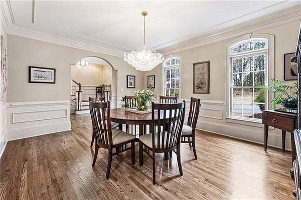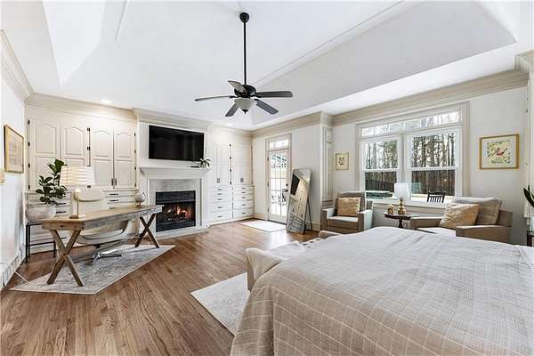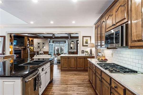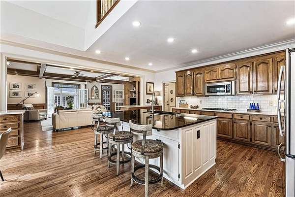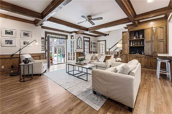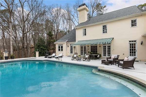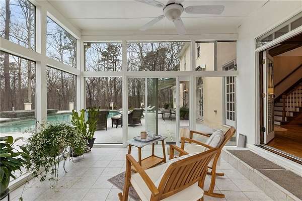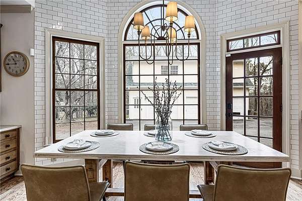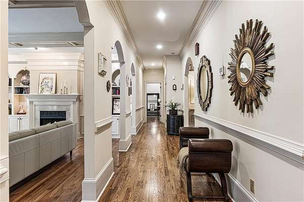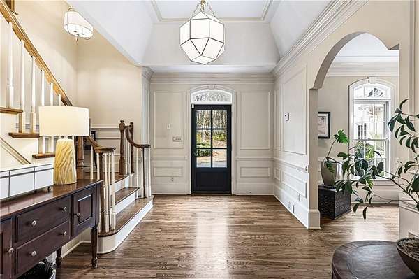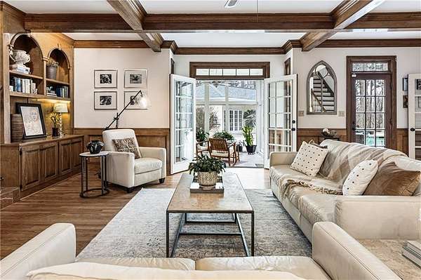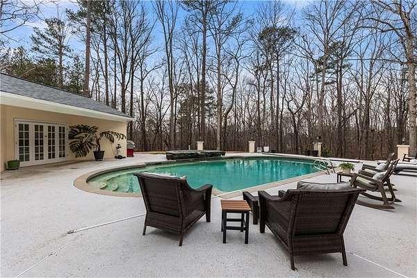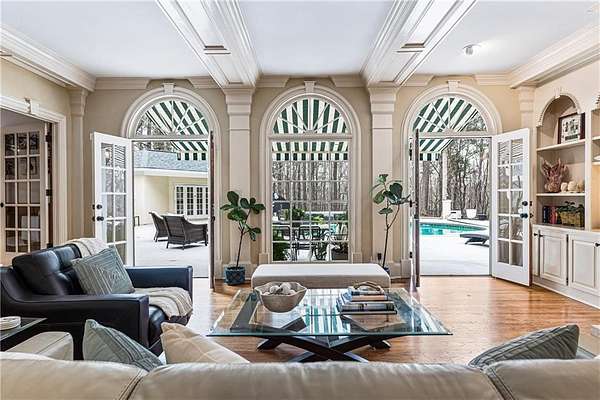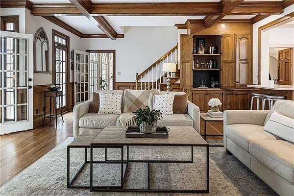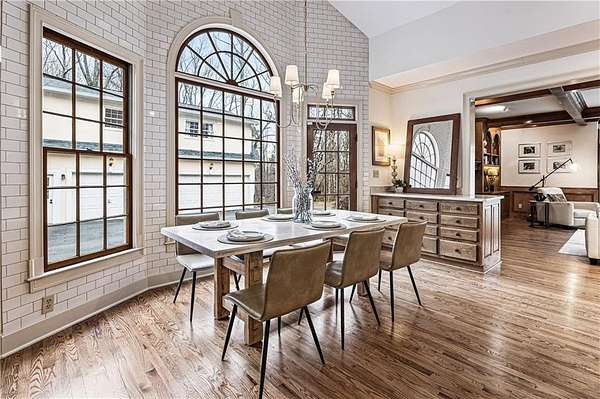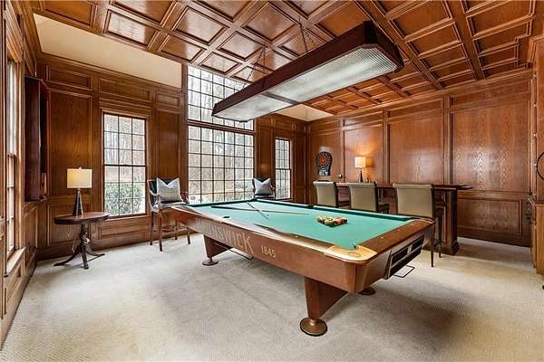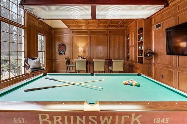 Proudly introducing a truly special estate on over 3 private acres in the heart of Milton. A picturesque drive leads through gated entry to a residence showcasing grand European architecture with timeless detailing, dramatic arches, and exquisite millwork reminiscent of classic 1960s Hollywood glamour. Hardwood floors span the main and upper levels, and updated main-level lighting enhances the home's warmth and elegance. The floor plan is thoughtfully designed for both everyday living and exceptional entertaining. The main level features a sought-after primary suite with renovated bath, spacious closet, and private outdoor access. The sunken living room offers a fireplace, custom built-ins, and double French doors opening to the outdoor living spaces. A fireside keeping room with stained coffered ceiling flows seamlessly into the sunroom and features a wet bar and additional built-ins. The gourmet kitchen serves as the heart of the home, offering generous counter space, updated countertops and backsplash, abundant cabinetry, a spacious island, and a cathedral-ceiling breakfast room filled with natural light. One of the home's most distinctive spaces is the main-level billiard room, richly finished with floor-to-ceiling stained judge's paneling, soaring ceilings, a Chicago-style bar, and French doors-an unforgettable entertaining environment. The finished terrace level offers exceptional flexibility. Originally designed as a true office space, it includes a separate entrance, breakroom, full bathroom, and multiple work areas. It currently functions as a gym, workshop, and generous storage space. Ideal for a small business, creative studio, home-based practice, or private executive workspace requiring additional parking and privacy. Outdoor living is equally impressive with a resort-style setting that includes a pool, expansive entertaining areas, and a cabana complete with mini kitchen and full bath. Car enthusiasts will appreciate the 3-car detached garage as well as the tandem 2+ car drive-under garage. Above the detached garage, a charming carriage house apartment offers a sitting area, bedroom, bathroom, and kitchen-ideal for guests, extended family, or au pair. A rare blend of architectural character, privacy, flexibility, and lifestyle in one of Milton's most desirable settings.
