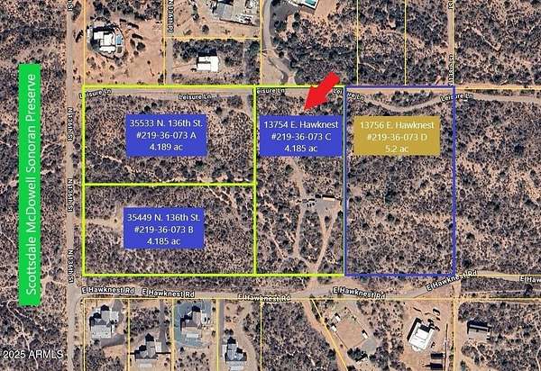 PRIME LAND! RIO VERDE FOOTHLLS: 4.2 ACRES, APN #219-36-073 C. Only 575' from the Scottsdale McDowell Sonoran Preserve, and down the street from the Tonto National Forest! Potential 4 lot split. Perfect for spec. homes, custom home estates or ranch. Enjoy panoramic views of 4 Peaks, Granite Mountain, and other majestic mountain ranges. Water wells nearby. Refer to parcel map under the document tab of the listing for lot layout.Adjacent parcels for sale: #219-36-073 A, 4.189 ac, Borders preserve, $399K, MLS #6883793. #219-36-073 B, 4.185 ac., Borders Preserve, $425K, MLS #6883788. #219-36-073 C, $405K, MLS #6883785. Buy parcels, A, B, & C, 12.56 acres and save!