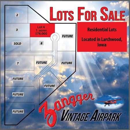 Residential lots just east of Larchwood, IA and situated on Zangger Vintage Airpark near the golf course. If you love all things aviation, this is for you!! If you desire beautiful scenery just outside of city limits in small town Iowa ~ all while being a short 15~minute drive to Sioux Falls, this is also for you!! The airport holds the distinction of being "vintage," not only for the fact of its age and historical importance to the Iowa aviation ecosystem, but also because "it`s best suited for vintage, tailwheel aircraft," Jim said. Still, it has a runway suitable for anything up to a light twin and sees traffic from modern aircraft as well. (Quoted from a "Flying Magazine" article written May 2022). It is the oldest privately owned public use airport in Iowa and is the only one in the state with three runways. It is honored to be the first and, arguably, the only residential airpark in the state. The lots themselves offer beautiful Iowa scenery, generously sized and ready for your dream home. Covenants stipulate an accessory building, if built, be designed as a hangar to be built on the lot with a home. The home should be situated on the lot to accommodate this possibility. Reach out for more information ~ builder will need to work closely with the airpark to ensure all FAA airspace restrictions are met for the safety of the homeowner and the pilots who use the airpark. This is an absolutely beautiful place to build a home whether you appreciate aviation or not. Owner wants to welcome all but also desires to incentivize aircraft owners with a $5,000 discount!!!!