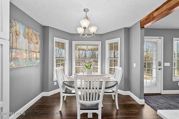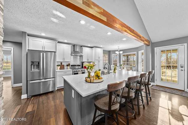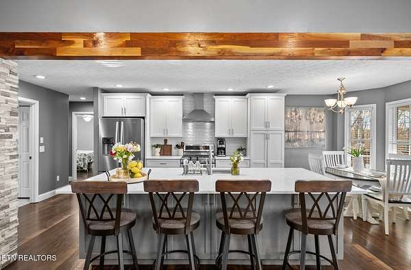 The kitchen was updated in 2019 and includes quartz countertops, white cabinetry with ample storage, stainless steel appliances, tile backsplash, and a large island that provides both workspace and seating. A dining area sits just off the kitchen with direct access to the back deck. A wood beam detail visually separates the kitchen and dining space while maintaining an open flow.