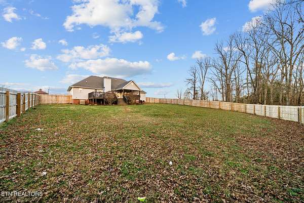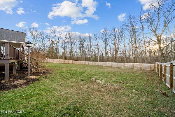 Outdoor living space includes a partially covered back deck and overlooking a fenced backyard area with wooded views beyond. The lot extends past the fenced portion, providing additional usable acreage and privacy.