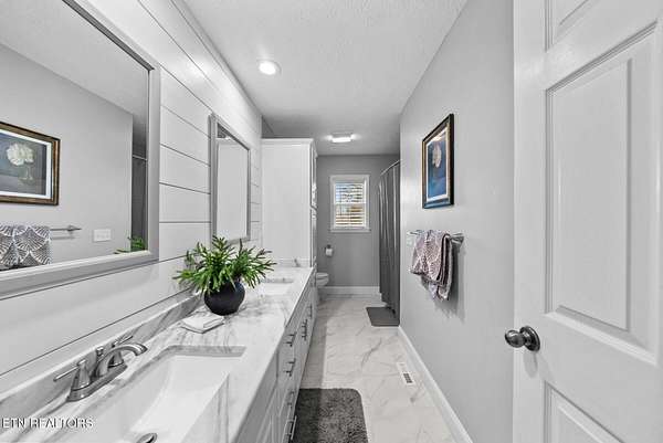 The primary bedroom is spacious and features a tray ceiling, hardwood flooring, and room for additional furnishings. The en suite bathroom includes a quartz-topped double vanity, updated fixtures, and a tiled walk-in shower with glass enclosure and built-in bench. Two additional bedrooms are located on the opposite side of the home, offering separation from the primary suite, with a full guest bathroom featuring an oversized double vanity and updated finishes.