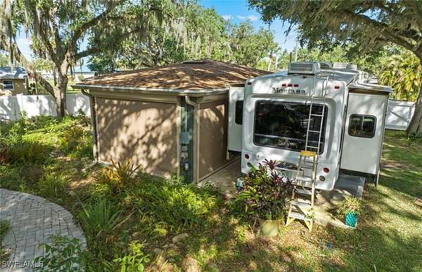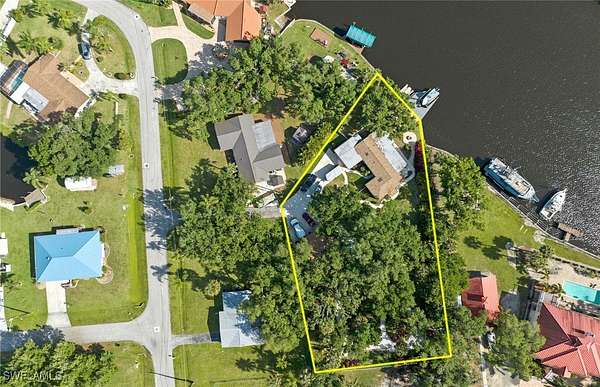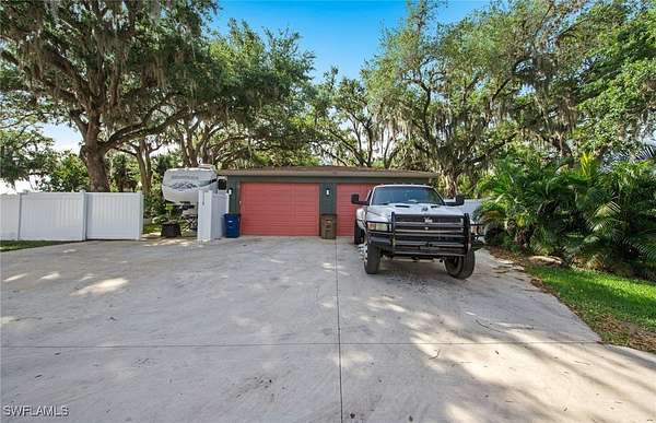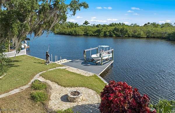 We offer an amazing opportunity to own almost 3/4 acre of river front property located in the River Forest community and situated on a protected oxbow of the Caloosahatchee River. Water carries good depth to accommodate most any vessel. There is a beautiful view across the oxbow of a protected island full of natural wildlife. The water front has a concrete seawall with composite dock and boat lift as well as a floating dock to accommodate 2 jet skis. There is also a new 1,100 SF masonry accessory building with OH garage doors and storm shutters. The landscape has been enhanced with an area of tropical gardens with paver pathways including irrigation and lv night lighting. The property is totally fenced with vinyl privacy fencing. There is an RV motorcoach parking pad with utilities. There is an existing home on the property that was flood damaged in Hurricane Ian. The home was cleaned out and drywall removedThis is an excellant oppertunity to build a new home to current FEMA standards on a completely improved 3/4 acre property with utilities in place and NO Impact fees for new construction !!