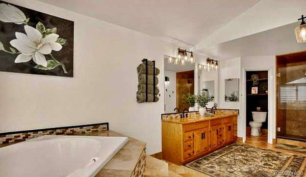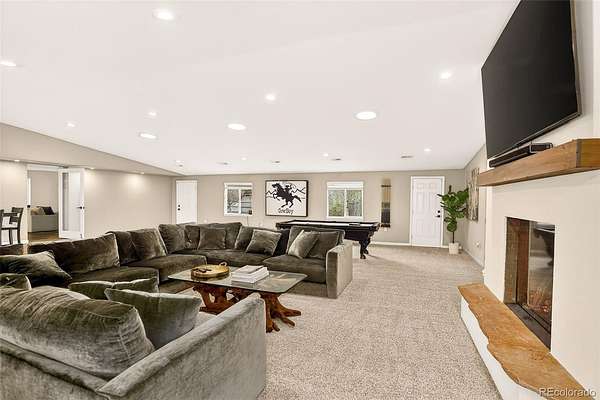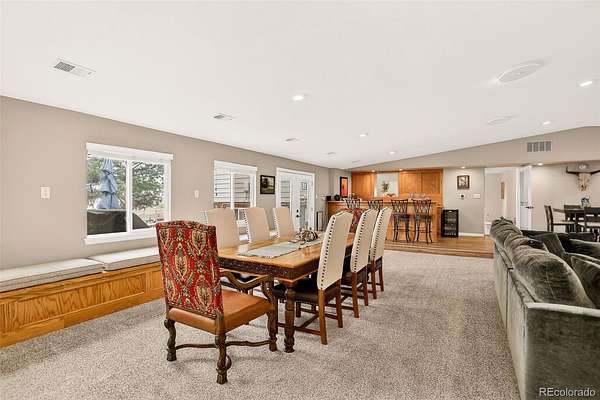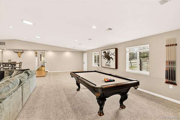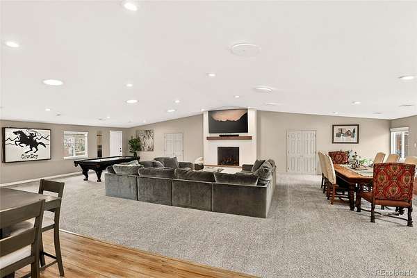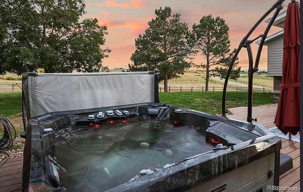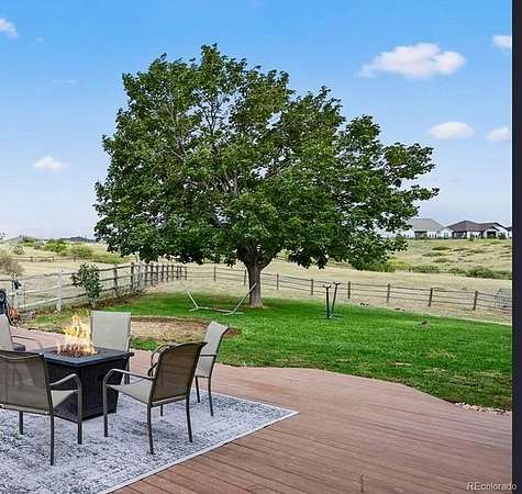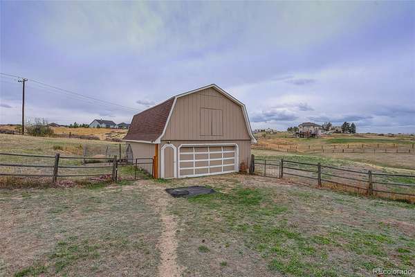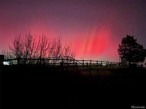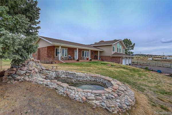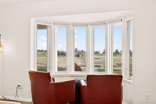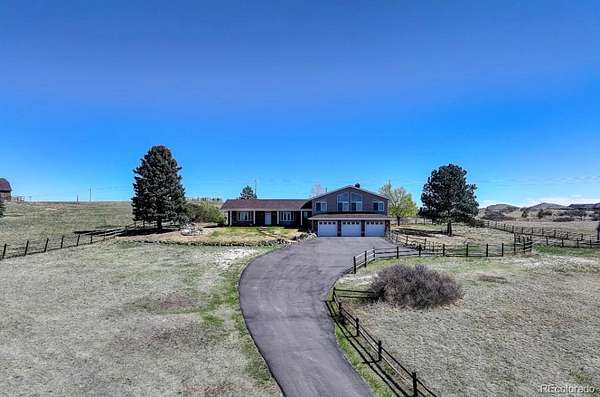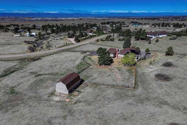 Bask in commanding views from Pikes to Longs Peak at the 5-acre Rancho Cielo (“Sky” or “Heaven”). This estate offers a blend of modern updates with timeless charm, creating a retreat that feels both elevated and warm! The lovely living room welcomes you with a cozy fireplace and large bay windows that perfectly frame the mountains. The kitchen/dining area share the same breathtaking panorama through their own bay windows. The beautifully refreshed kitchen offers granite countertops, a large island, stainless steel appliances, updated lighting, and a walk-in pantry. Next, step into the home’s showpiece: an impressive 1,400-sq-ft great room designed for unforgettable entertaining. This space features a full wet bar, a dramatic floor-to-ceiling fireplace, and surround sound. French doors open to a private outdoor oasis with TREX deck, hot tub, and a gas grill—perfect for gatherings or quiet evenings under a star-filled sky! Upstairs, the primary suite has vaulted ceilings, bay windows with plantation shutters, attached bonus space, and more mountain vistas! The en-suite bath includes a soaking tub, separate shower, dual vanities, and generous closet space. Two additional bedrooms and baths complete the upper level. The lower level has versatile space ideal for multi-generational living, office, or bedroom - with cozy fireplace sitting area and nearby bath. Downstairs is another spacious bedroom or bonus room with closet and egress. Outdoors, enjoy the serene covered front porch year-round while watching wildlife or stunning sunsets! Equestrian amenities include a 2-stall barn, fenced pastures, and access to neighborhood bridle paths. The 3-stall garage includes an EV charger, and 1-acre yard features an electric fence. Newer solar panel system is owned! Located minutes from downtown Parker and E-470, this property is quick access to DTC, downtown and endless recreation. Rancho Cielo offers a rare opportunity to own a sanctuary with unmatched views! NO HOA!
