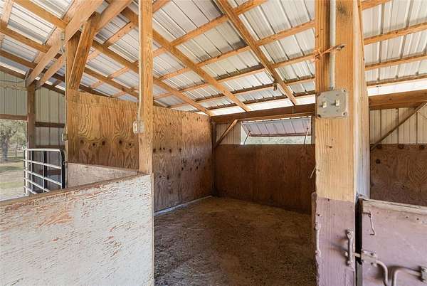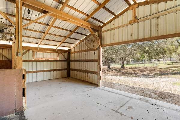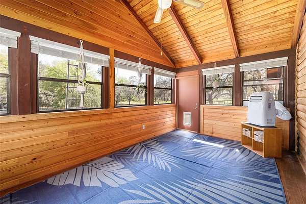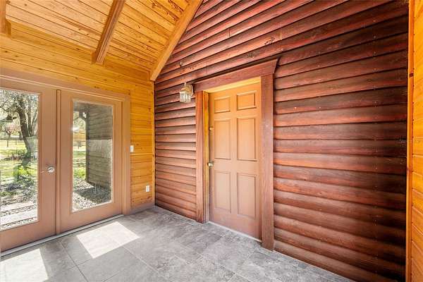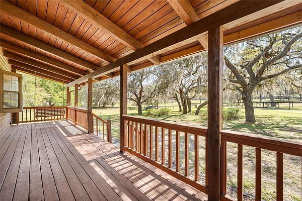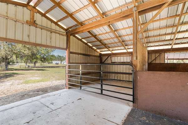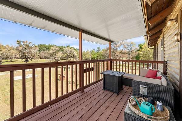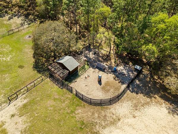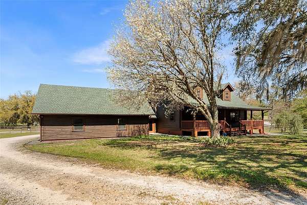 A truly exceptional 7.98-acre equestrian estate in North Central Florida! This stunning custom log cabin home is ideally situated near world-class destinations including the World Equestrian Center, HITS, Black Prong Equestrian, and the scenic trails of Goethe State Forest—with the rare advantage of direct access right from your own back gate, only a short ride away. Ride, walk, or drive through miles of picturesque dirt roads and preserved land, all from the privacy of your property. From the moment you arrive, you are greeted by sweeping pastures, majestic old oak trees, and vibrant blooming azaleas, capturing the tranquility and natural beauty of this property. The inviting front porch offers the perfect vantage point to take in the peaceful surroundings and enjoy quiet mornings or golden-hour sunsets. Inside, the home is filled with warmth and character, showcasing vaulted tongue-and-groove ceilings, exposed wood beams, and an abundance of natural light throughout. This thoughtfully designed residence features 3 bedrooms and 2 bathrooms, including two primary suites, one on each level, offering flexibility and privacy for family or guests. The upstairs primary retreat is truly special, with soaring ceilings and sliding glass doors that open to a private balcony overlooking the back of the property. An ideal place to unwind and take in the breathtaking views. The second level also includes an additional bedroom with a versatile bonus space, perfect for an office, playroom, or creative studio. Each bedroom offers generous storage with walk-in closets and bright, airy spaces. A sun-drenched sunroom provides even more flexible living space, complete with its own portable air conditioning unit and access to the side yard. The enclosed breezeway connects to an oversized two-car garage, which is a standout feature in itself! Offering a second laundry area, full bathroom, and a loft that could easily be transformed into additional living space, guest accommodations, or a private studio. Designed with the equestrian enthusiast in mind, the property is fully equipped and ready to go. The 4-stall (12x12) horse barn features a concrete center aisle, along with two additional concrete bays for equipment storage and electric. Five spacious paddocks are fully fenced, complemented by three horse shelters, providing excellent rotation and care options. A newly built chicken coop with ample storage adds to the charm and functionality of the farm. Additional features include a large concrete carport for covered parking, a whole house generator with automatic transfer switch, underground 500-gallon propane tank, EV charging capability, electric gate, and numerous recent updates including a 2024 roof, 2022 HVAC system, and fresh exterior staining in 2023. As the day winds down, gather around the beautifully built-in fire pit area and take in the peaceful surroundings under the stars. This is more than a property, it is a lifestyle. A rare opportunity to own a private, turnkey equestrian retreat with direct trail access and endless possibilities.
