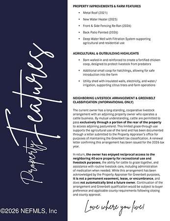 Set on nearly four acres, this small farm offers space, privacy, and the freedom of a true rural lifestyle. The home features generous living areas, a welcoming kitchen with island seating, and a stone fireplace that anchors the main living space. Outside, fenced pasture, citrus trees, a fortified barn-style chicken coop, and a separate small coop support a variety of animals and farm life. A utility shed with power and running water/irrigation adds flexibility for storage, projects, or maintaining the citrus trees. The open, usable land provides room for livestock, recreation, or future expansion, all while enjoying peaceful views and privacy. Zoned agricultural with Greenbelt benefits in place. A rear-property livestock graze-through supports the Greenbelt classification (2026 renewal on file) and is a non-permanent arrangement. See documents for details.