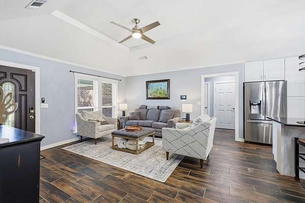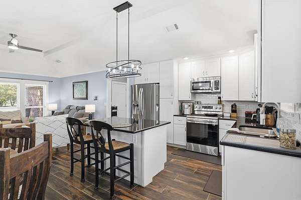 Step inside and you'll love the open, airy layout with plenty of natural light, stylish wood-look tile floors, and a cozy living area that flows right into the kitchen and dining space. The kitchen is a true gathering spot with granite countertops, island, and stainless steel appliances.