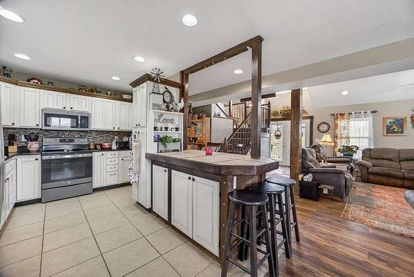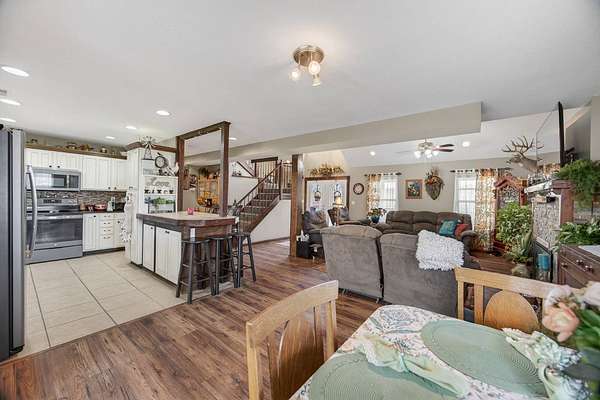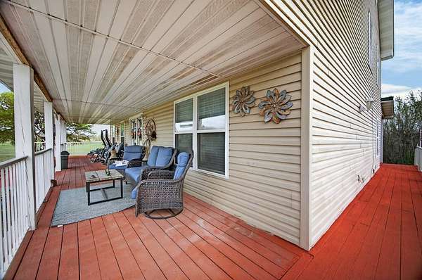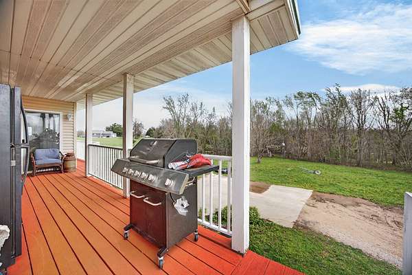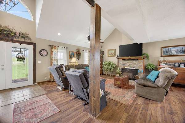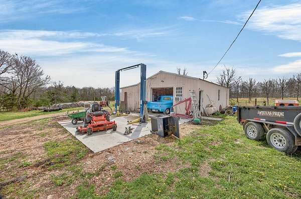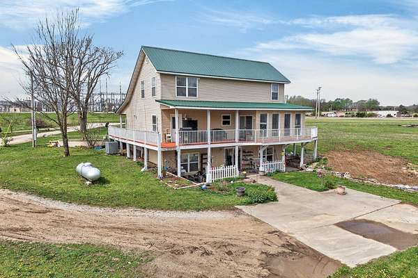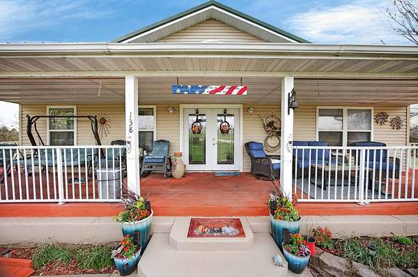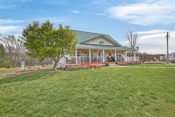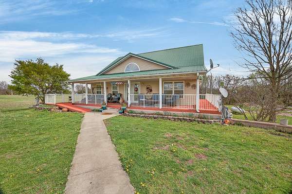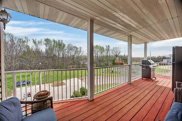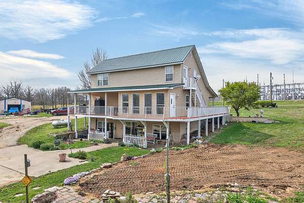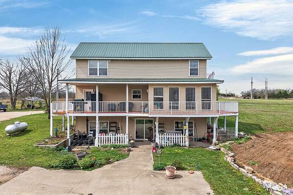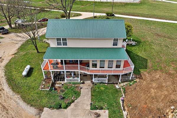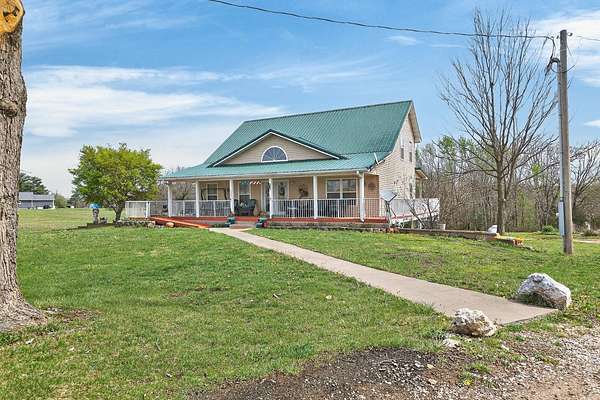 Don't miss this charming farmhouse situated on approximately 5 acres just minutes from Camdenton High School! This spacious 4-bedroom, 3-bath home offers the perfect blend of peaceful country living with convenient access to town and a short drive to Lake of the Ozarks. From the moment you arrive, you'll be drawn to the inviting wraparound porch-ideal for enjoying mild days and scenic views. Inside, the main level features an open-concept design with a soaring ceiling and overlook from the upper level, creating a bright and airy feel throughout. The kitchen includes a bar area that flows seamlessly into the living room, perfect for entertaining. Just off the kitchen, you'll find a cozy sunroom-an ideal spot to relax with your morning coffee. The main level includes one bedroom and one full bath. Upstairs, the private primary suite offers its own bathroom and beautiful views of the surrounding property. The walkout basement provides additional living space with two bedrooms, a full bath, and a partial kitchen-perfect for guests, extended family, or potential in-law quarters. This home has seen several updates in recent years, including a newer metal roof. The property also features multiple outbuildings, providing ample space for storage, hobbies, or equipment. Additional highlights include a septic system and central HVAC. If you're looking for space, functionality, and a great location near town and the lake, this property is a must-see. Schedule your showing today!