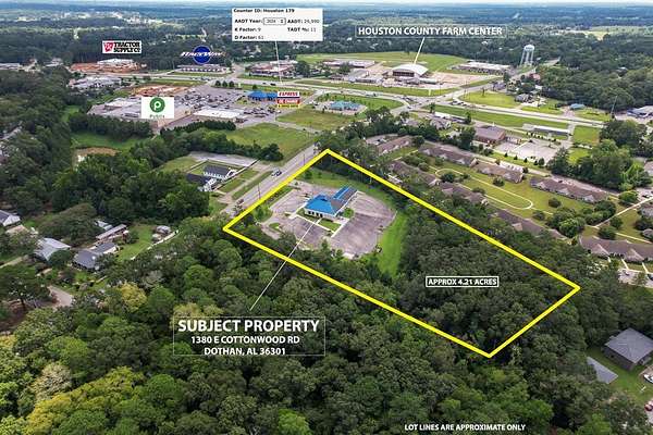 Est $10,188/moAmazing opportunity to own a commercial building formerly utilized as a financial institution sitting on approximately 4.21 acres inside Dothan City limits. With approximately 4500 square feet, 4 large offices, vault, multiple teller windows, break room, drive thru lanes and windows, this property has numerous possibilities. 3 phase power is already in place. Separate entrance/exit lanes with approximately 50 parking spaces and complete drive around paving. Conveniently located to Publix, Tractor Supply, Houston County Farm Center, and more. Occupancy restrictions may apply, please call listing broker.
