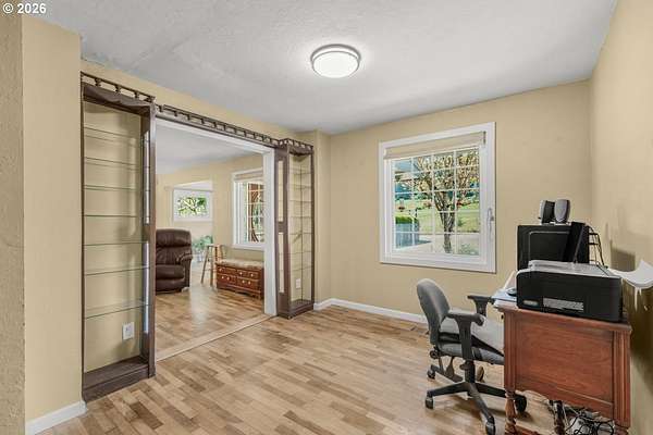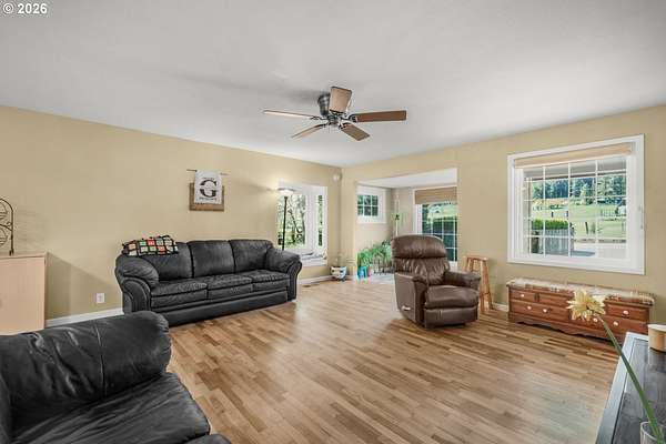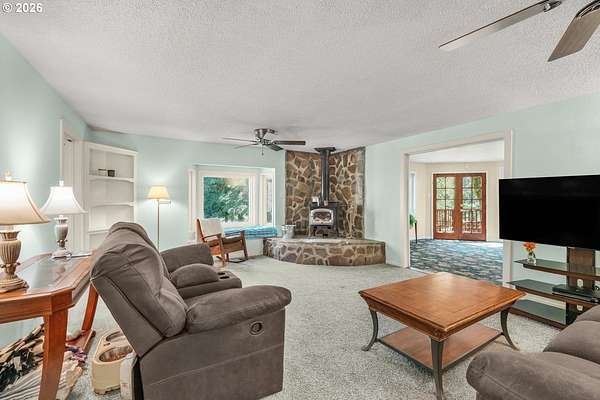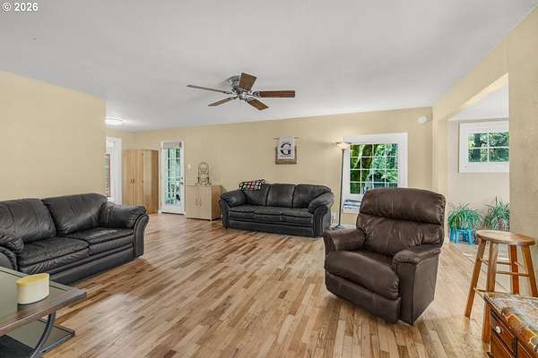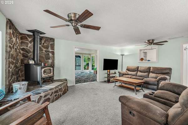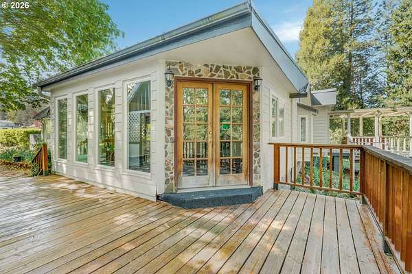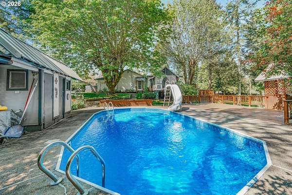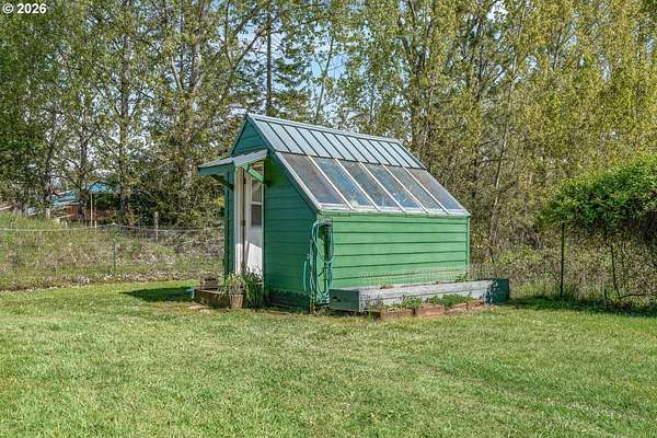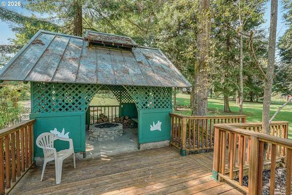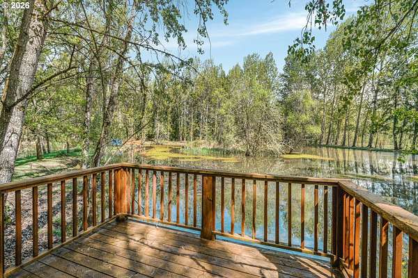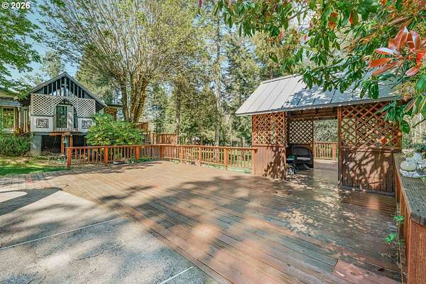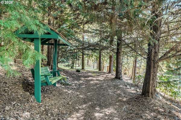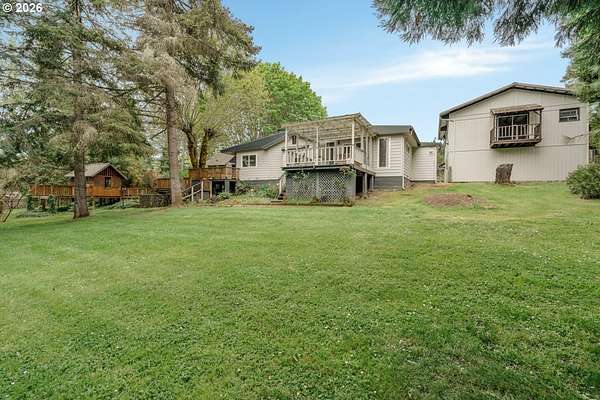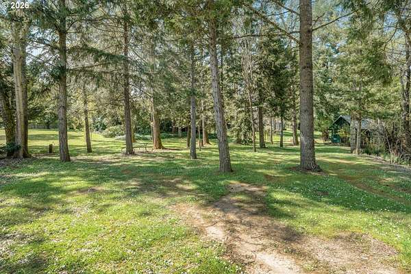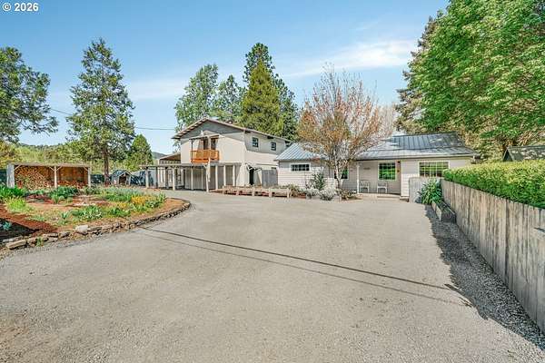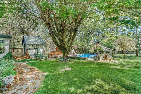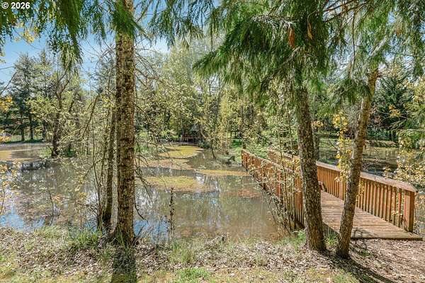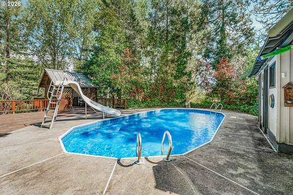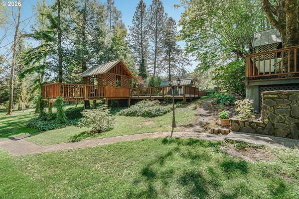 Tucked away on 3.28 acres of lush, park-like grounds, this one-of-a-kind Oregon retreat offers more than a home, it delivers an experience. Surrounded by mature trees and natural beauty, the property lives like a private resort, designed for both peaceful living and unforgettable gatherings. From the moment you arrive, the setting feels worlds away. Meandering paths lead to a tranquil pond with its own gazebo and firepit, while multiple outdoor entertaining spaces create the perfect backdrop for events, celebrations, or quiet evenings under the stars. The resort-style pool with slide, expansive decking, and shaded gathering areas bring summer to life, while the open grounds and thoughtfully placed structures offer flexibility for hosting, relaxing, or bringing your vision to life. There is a well for irrigation and watering the garden, lawn with a new pump and pressure tank. Inside, the 2,400 sq ft home blends comfort and functionality. Natural light fills the sunroom, where walls of windows frame the surrounding landscape and open seamlessly to outdoor living spaces. Multiple living areas, wood-burning stoves, and a spacious primary suite with private deck access create an inviting atmosphere that feels both warm and expansive. The property continues to impress with a 2-car garage/shop, bonus space above, RV parking, and additional outbuildings that are ideal for storage, hobbies, or potential event use. The layout and natural separation of spaces make this property uniquely suited for a private retreat, multi-use living, or income opportunity. All just minutes from town, yet offering rare privacy and tranquility. This is more than a home, it's a destination.