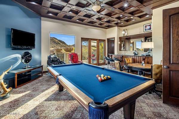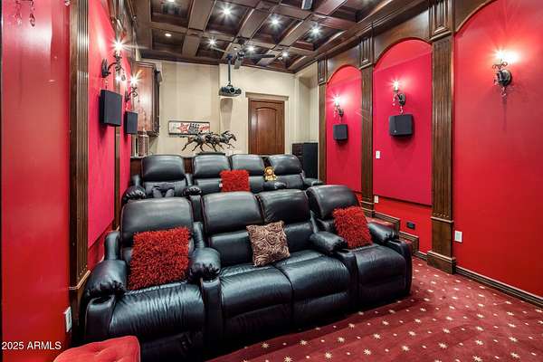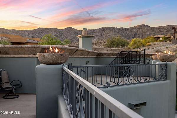 Stunning 7,600+ sq ft luxury retreat in gated Canyon Reserve featuring 6 bedrooms, 5 full bathrooms plus 3 Half Bathrooms, soaring 12-14 ft coffered ceilings, arched hallways, and breathtaking mountain views. The chef's kitchen boasts Dacor appliances, granite counters, cherry cabinetry, and a walk-in pantry. Enjoy a home theater, game room with wet bar, gym, and spa-like primary suite w/ steam shower and jacuzzi tub and laundry hook ups in walk in closet. Outdoor living includes verandas, a private pool/spa, synthetic turf, and mountain vistas. Built with energy-efficient ICF block. Includes a private guest casita with separate entrance. 2 New Trane AC Units/Elevator in house and whole house water filtration system. Rhino Shield Exterior Paint with 22yr warranty. 3 bedrooms have ensuites Whole house water filtration system and water softner. A rooftop deck offers sweeping views perfect for sunrises, sunsets, and stargazing. Located within the Mountain Park Ranch Community, residents enjoy access to resort-style pools and spas, tennis and pickleball court & walking and biking trails, and top-rated schools.