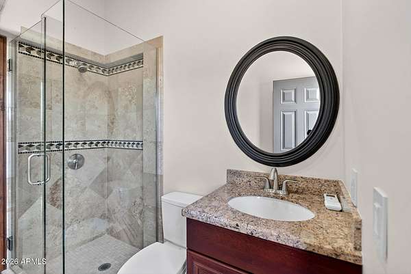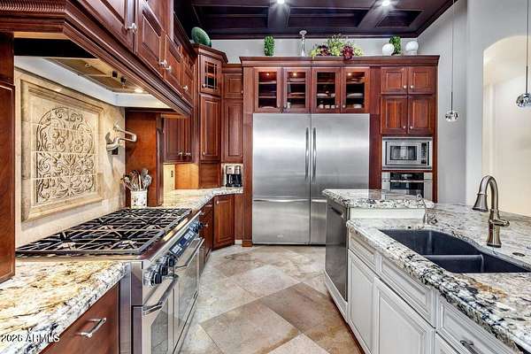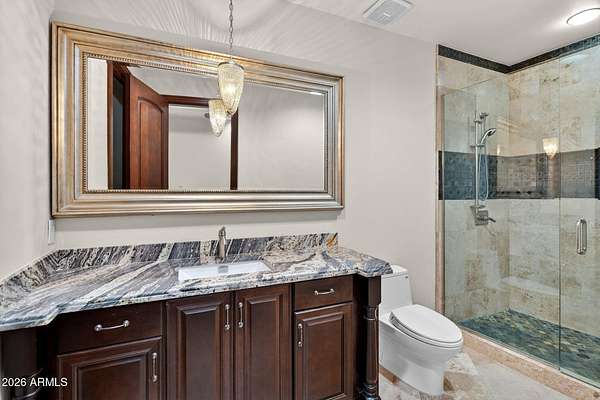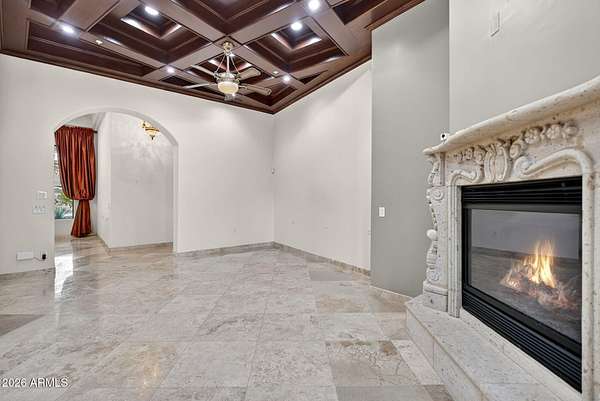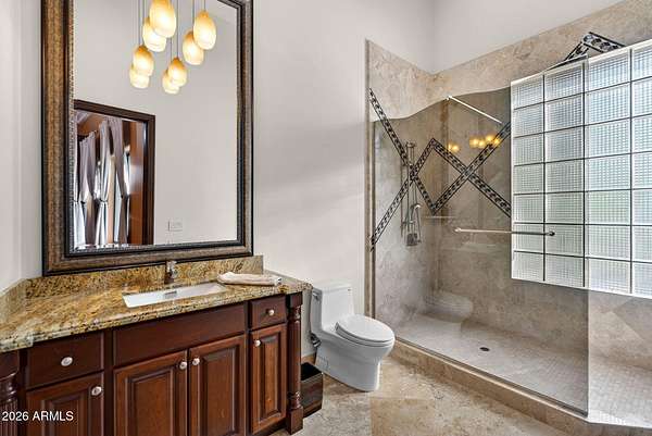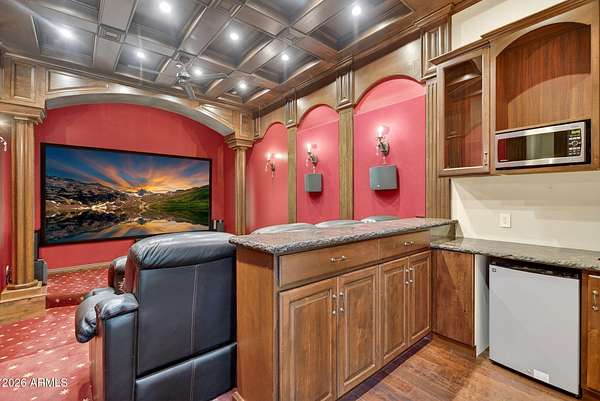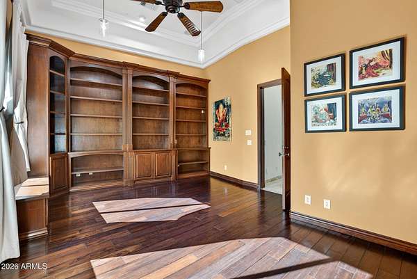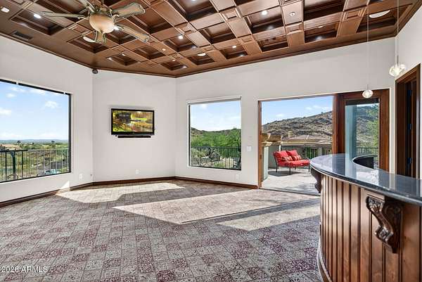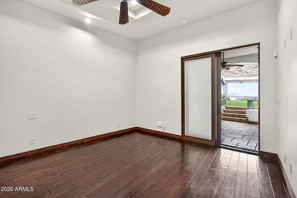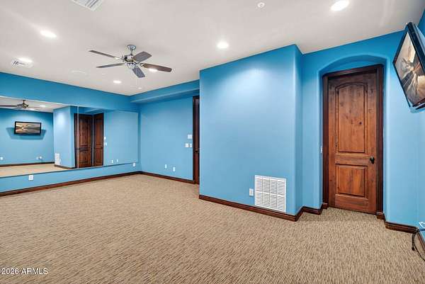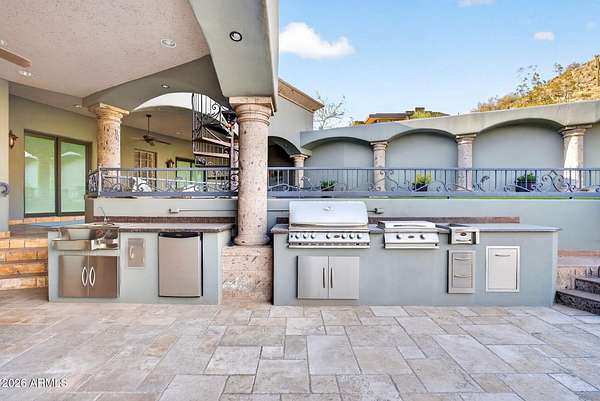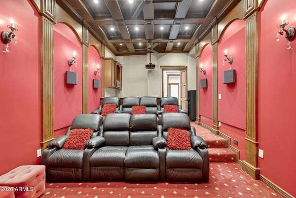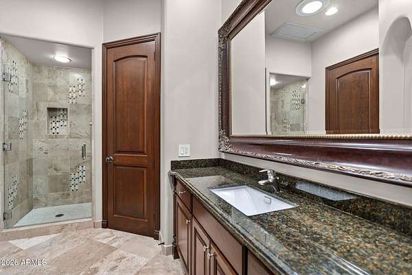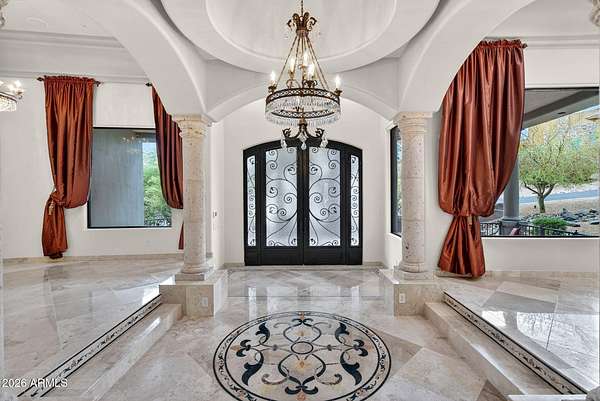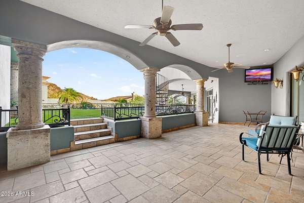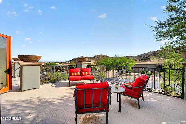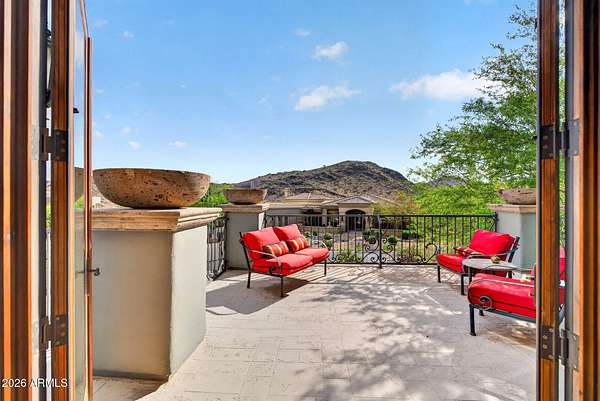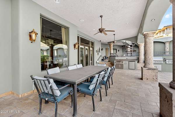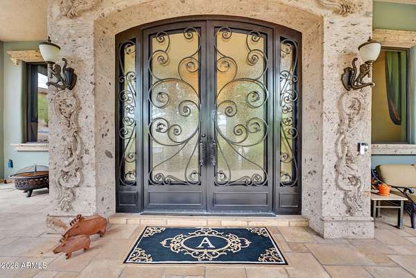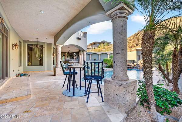 Located in the prestigious gated community of Canyon Reserve, this custom luxury home features ICF construction (solid concrete, wrapped in insulation) for exceptional efficiency and durability. Designed for indoor-outdoor living, enjoy a resort-style backyard with pool, waterfall, grotto, and slide, plus expansive covered patios and a full outdoor kitchen. The home offers multiple ensuite bedrooms, a private casita with kitchenette, game room with balcony, theater with snack bar, and a versatile lower-level flex space. A rooftop deck captures mountain views, and an in-home elevator adds everyday convenience. Exceptional design, quality, and lifestyle throughout. This custom luxury residence blends thoughtful design, quality construction, and exceptional indoor-outdoor living. A grand entry opens to formal living and dining spaces, leading into a spacious great room and a well-appointed kitchen designed for both everyday living and entertaining. Rich finishes, custom cabinetry, and quality materials are carried throughout the home. The flexible floor plan includes multiple ensuite bedrooms, offering comfort and privacy for family and guests alike. A standout space functions as a bedroom, library, or home office, complete with custom built-ins and its own private bath. The primary suite provides a true retreat, while additional bedrooms include both private ensuites and a thoughtfully designed Jack & Jill layout. The game room serves as a central gathering space, featuring a built-in bar and direct access to a private balcony with mountain views--perfect for relaxing or entertaining. A dedicated home theater with tiered seating and a snack bar creates a true cinema experience. Outdoor living is where this home truly shines. The resort-style backyard features a pool with waterfall, grotto, and slide, surrounded by expansive patios designed for entertaining. A full outdoor kitchen, covered dining areas, and multiple seating spaces create a seamless indoor-outdoor lifestyle ideal for Arizona living. A detached casita offers a private retreat for guests, complete with its own entrance, kitchenette, and full bathroom--ideal for extended stays or multi-generational living. Additional features include a rooftop deck capturing sweeping mountain views, a lower-level flex space ideal for a gym, studio, home business, or hobby area, and an in-home elevator connecting the garage level to the main living area for added everyday convenience. From its versatile layout to its resort-style amenities, this home offers a rare combination of luxury, functionality, and lifestyle.