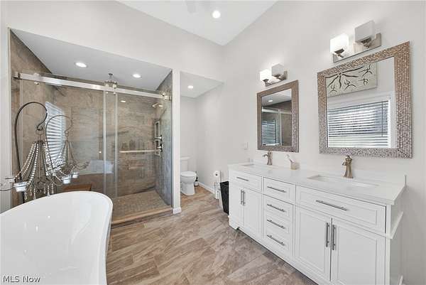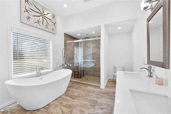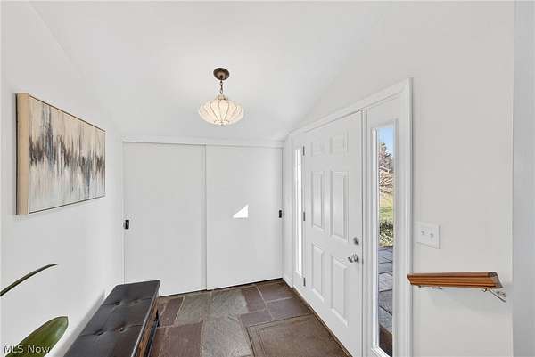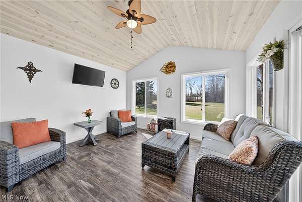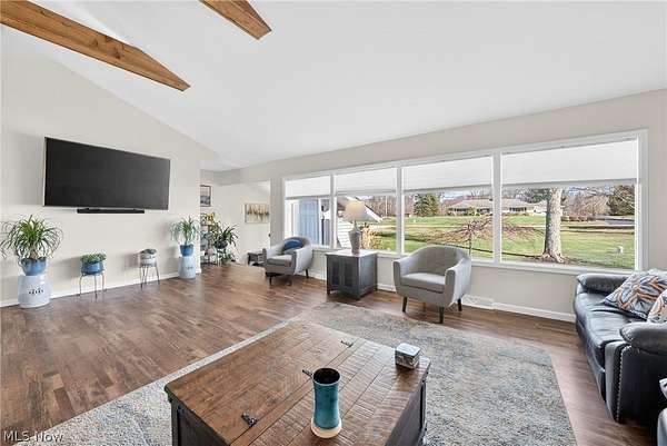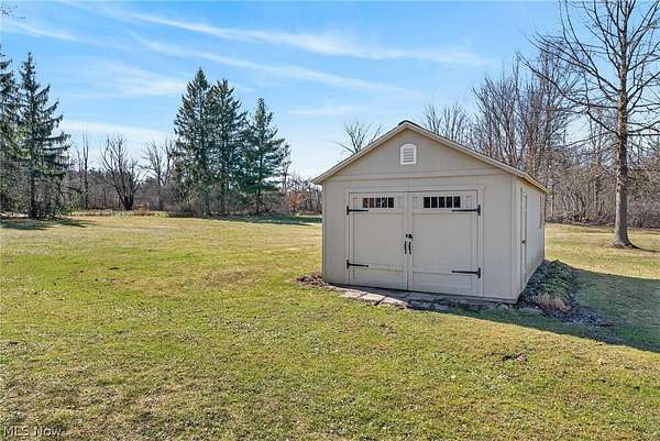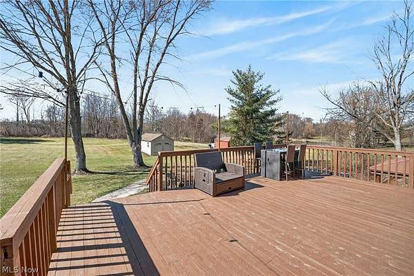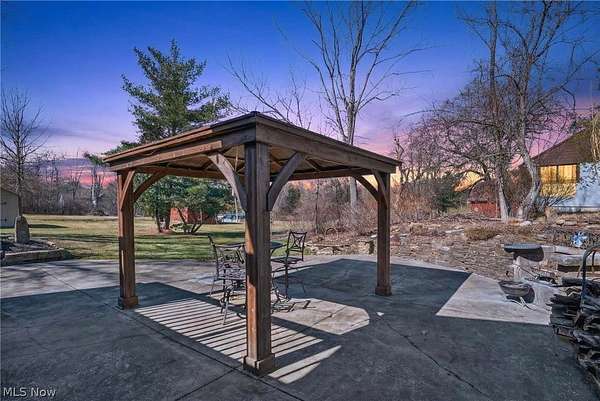 Welcome to this beautifully renovated 4-bedroom, 4-bath ranch set on a private 1.5-acre lot in Novelty. This spacious home features vaulted ceilings with exposed wood beams, two fireplaces, and an open layout with new flooring that creates a warm and inviting atmosphere. Enjoy your morning coffee in the stunning vaulted sunroom addition with picturesque views and direct access to the expanded deck, bridge walkway, and pavilion. Perfect for relaxing or entertaining. The updated kitchen offers granite countertops, a large island, and newer stainless steel appliances. The primary suite features a spa-inspired bath with a large tiled walk-in shower, frameless glass door, soaking tub, and an expanded walk-in closet with private deck access. The finished walkout basement provides additional living space with a second kitchen, tiki wet bar, workshop, and ample storage, ideal for entertaining, hobbies, or extended living. Outdoor living shines with a renovated deck, pavilion, outdoor fire pit, and lower-level concrete patio, all overlooking the peaceful 1.5-acre setting. Additional updates include a new furnace (2025), upgraded electrical, newer siding, gutters, garage door, windows, invisible fence, and a large garage/shed for extra storage. Located on a quiet street just minutes from schools, shopping, and dining, and part of the highly desirable West Geauga School District.
