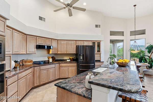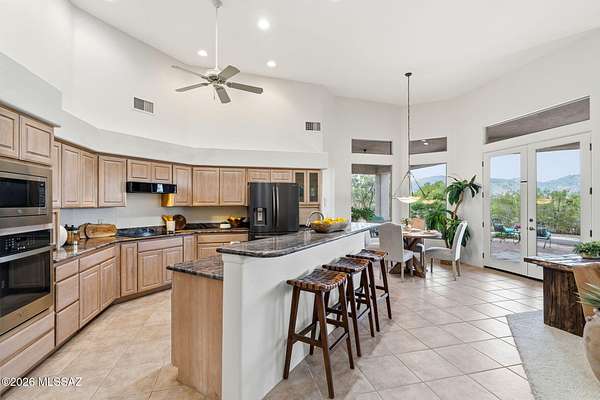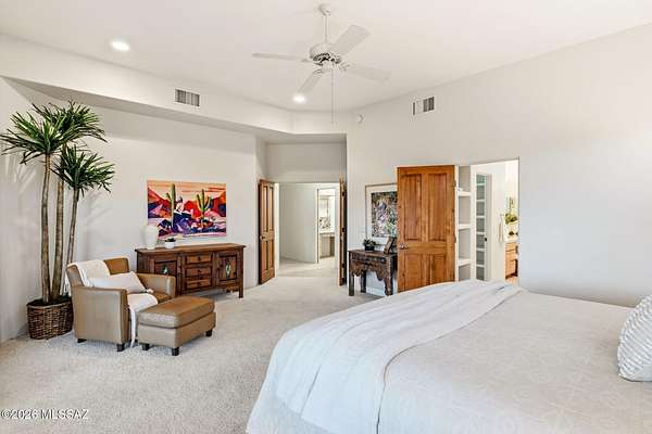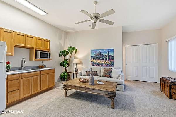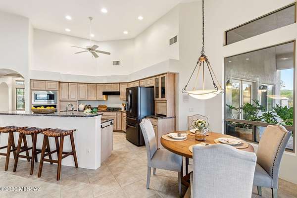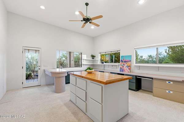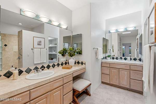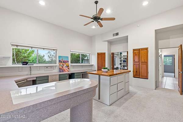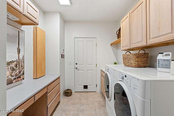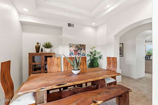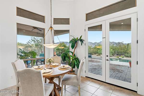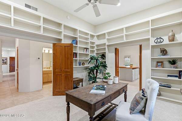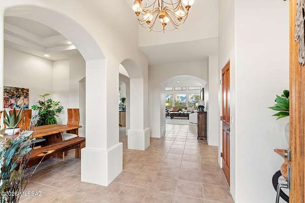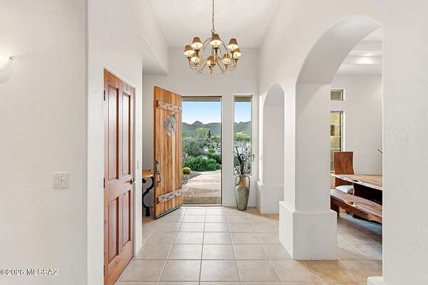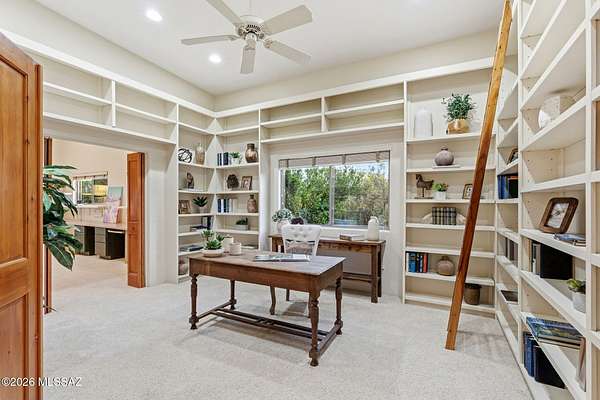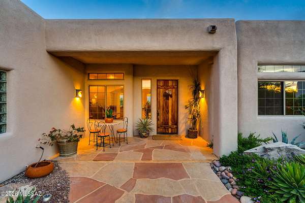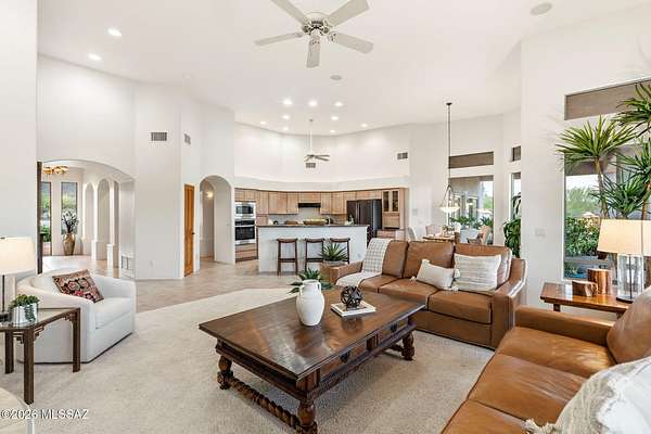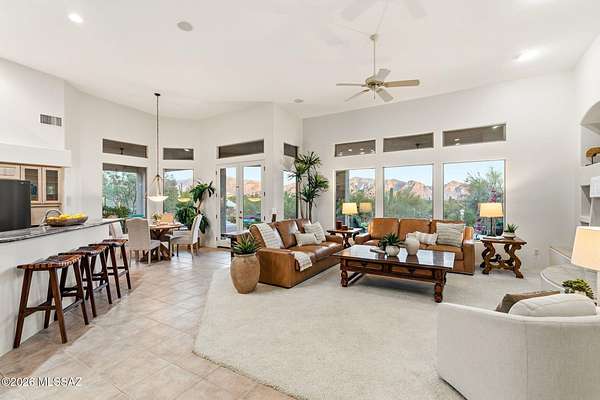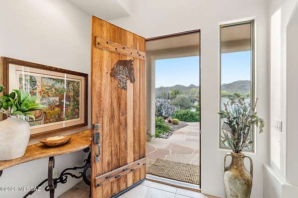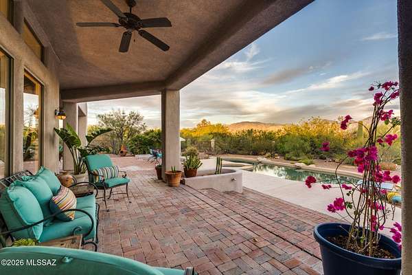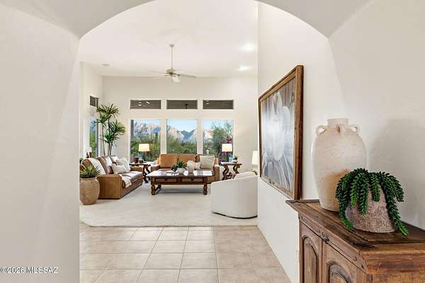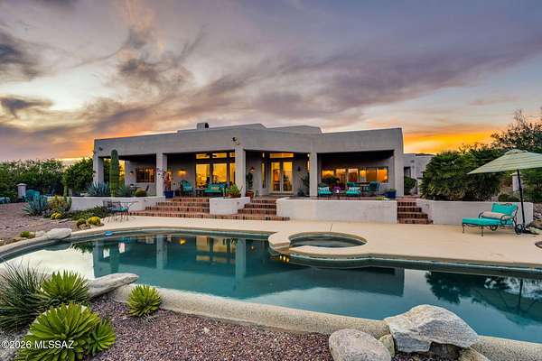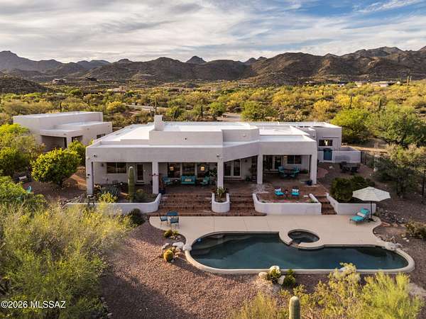 A Desert Oasis Set on over 4 acres with sweeping mountain views in every direction. This exceptional property captures the beauty of the Sonoran Desert w/ the Tortolita Mountain views to the front & stunning Pusch Ridge views to the rear. The 3-bedroom main residence w/ a dedicated library offers a desirable split bedroom floor plan for added privacy, while the detached 356 sq ft casita w/ full bath functions perfectly as a fourth bedroom for guests, multigenerational living, or a private office. Expansive windows, soaring ceilings, & a warm neutral interior color palette fill the home with natural light, while generous living areas & a cozy fireplace provide comfort and versatility. Designed for true Arizona outdoor living, the backyard features a sparkling pool and spa with solar heating along with multiple covered patios ideal for relaxing, entertaining, and taking in the peaceful desert sunsets. Car enthusiasts, hobbyists, and outdoor adventurers will appreciate the incredible garage capacity, including a 3-car garage, dedicated RV garage that could also function as a 2-car plus tandem garage, and an additional garage space currently utilized as a 544 sq ft workshop, providing exceptional storage and workspace options. With room to spread out, breathtaking views in every direction, and versatile amenities throughout, this property offers privacy, functionality, and the relaxed luxury of desert living in a highly desirable setting.