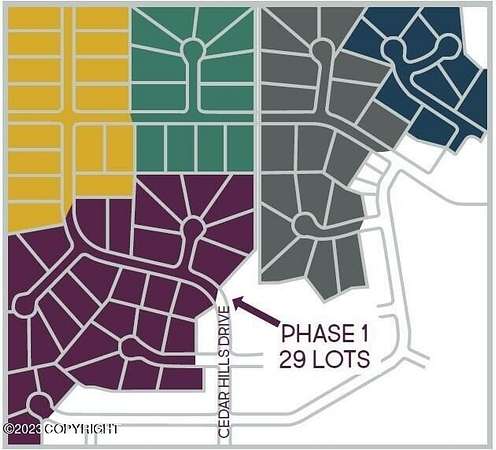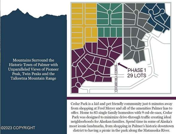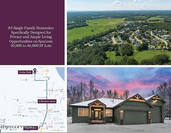 Est $686/moA MUST-SEE FOR ALL BUILDERS AND DREAM HOME SEEKERS! Discover the perfect opportunity to build your dream home in the beautiful community of Cedar Park - just 5 minutes from downtown Palmer yet surrounded by the stunning natural beauty of Alaska! This spacious cul-de-sac homesite offers southern exposure in the backyard, ideal for growing lush gardens and prize-winning vegetables for the state fair. Enjoy peace, privacy, and breathtaking views while staying close to schools, shopping, and recreation. Owner financing is available! Don't miss out call today for more details and start building your Alaskan dream!