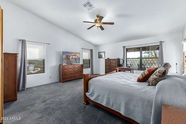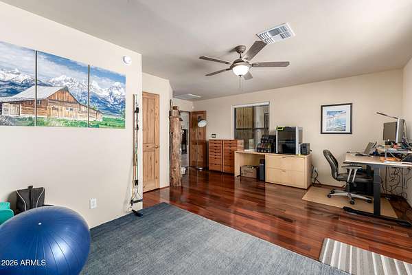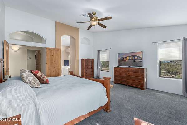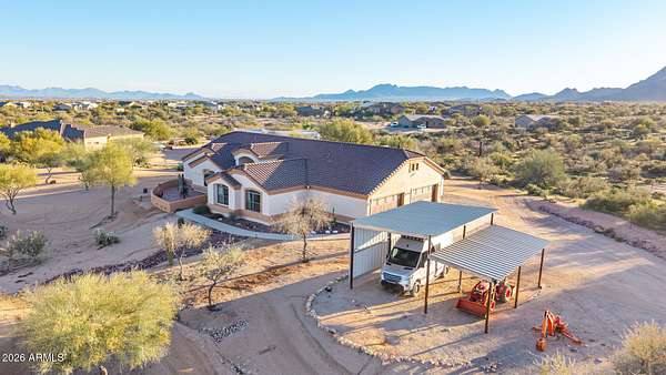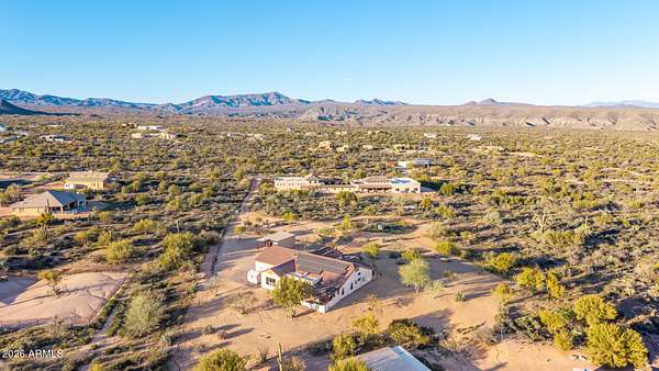 Here is a rare 2.5 acre home with its own water well and paid for solar. Positioned on an elevated lot, you have views of all the surrounding mountains. The home is designed to enjoy mountain views from every room. Inside you will find stunning hardwood floors, soaring vaulted ceilings, granite counters, and natural wood accents throughout. The 5th bedroom is a massive room that would make a great office or hobby room. The large, split floorplan master bedroom includes a large granite double vanity and a huge closet. This home has a great extended back patio for entertaining, and a front patio designed to enjoy the peaceful, quiet views. It has a 4 CAR GARAGE with a 2-car garage screen door. This large lot has plenty of room for horses, guest house, or workshop. Enjoy the privacy & peacefulness of the desert! Close to Tonto National Forest and Scottsdale Preserve for unlimited hiking, biking, horseback riding, or motorized vehicle exploration. Country living yet only 15 minutes to grocery store, gas station, or restaurants.