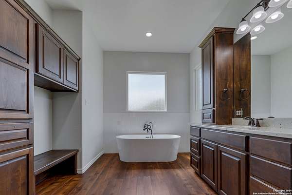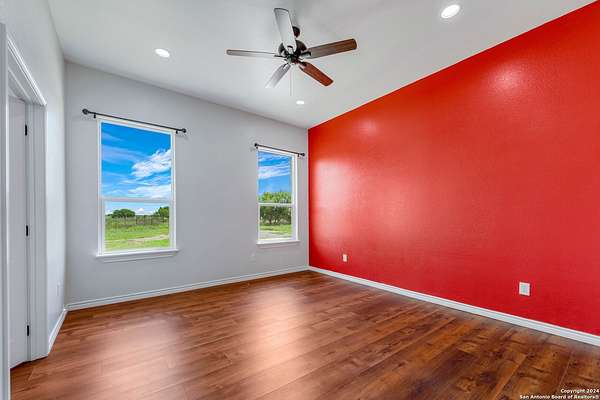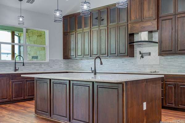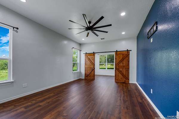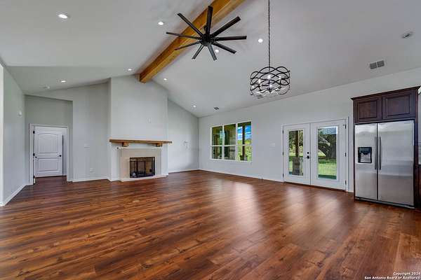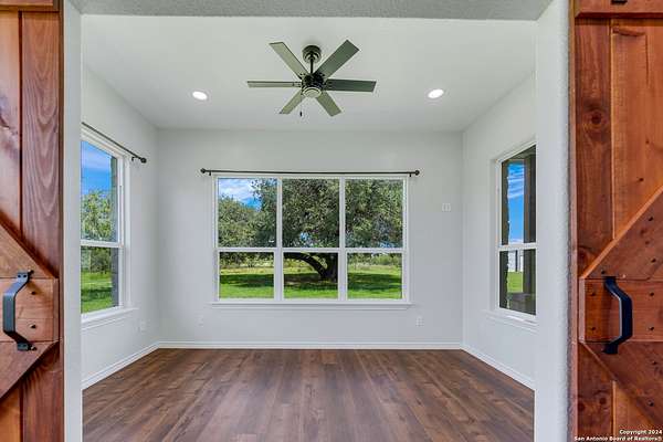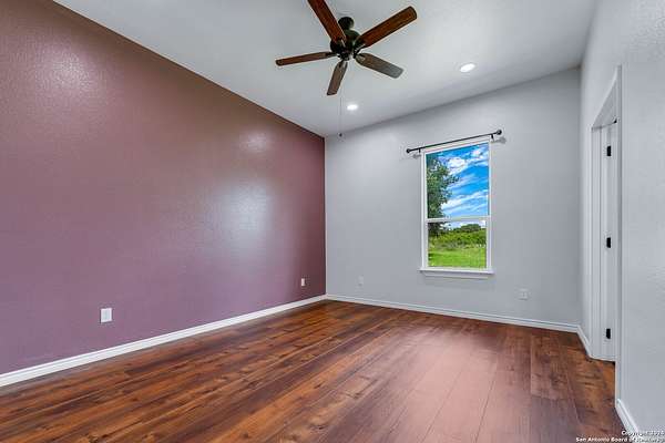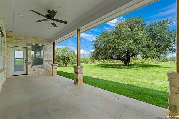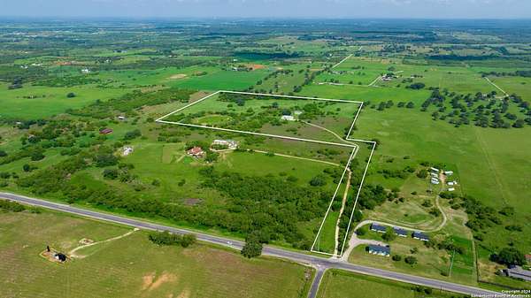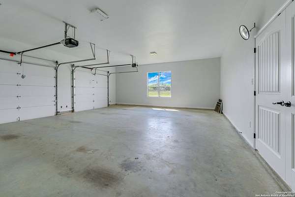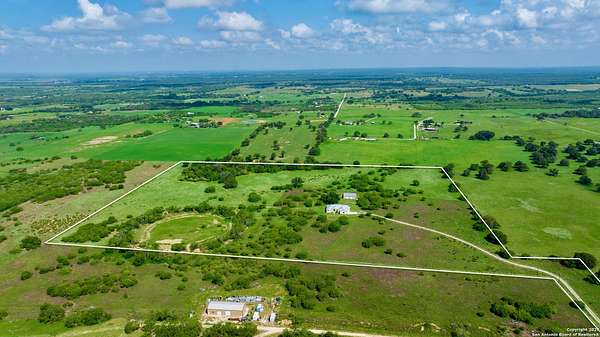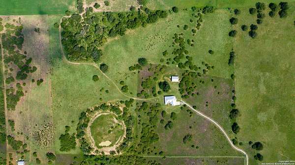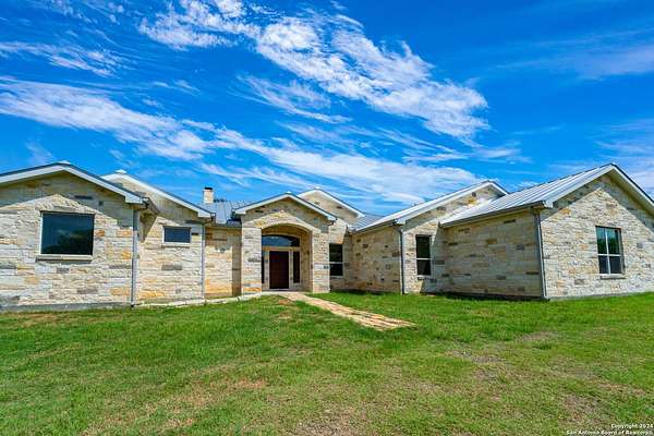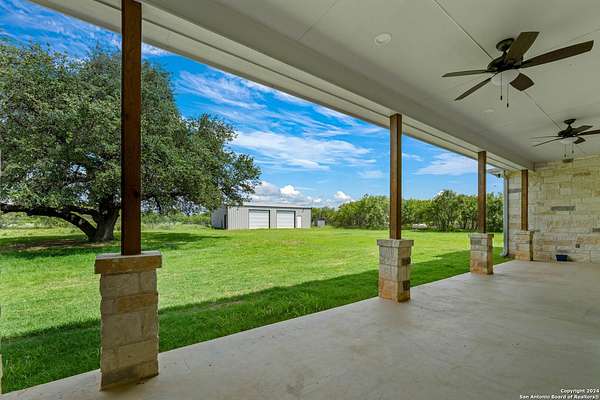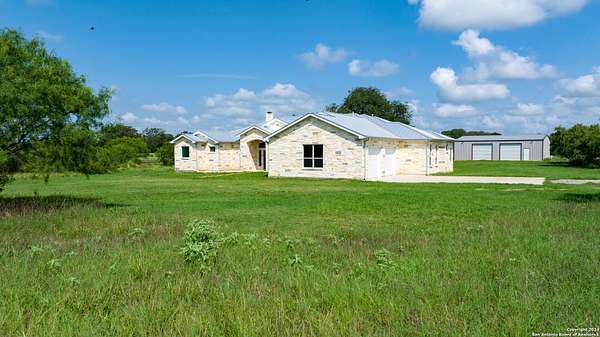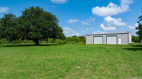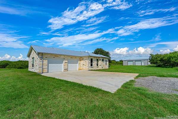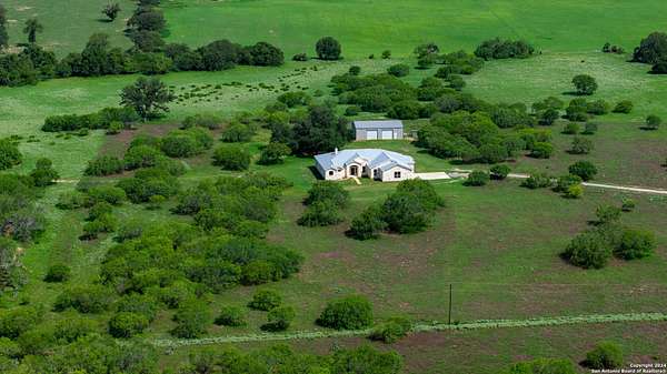 This exquisite property, nestled on 40 acres of serene landscape, features a stunning open-concept home designed for both luxury and practicality. The expansive living space is highlighted by a cathedral ceiling, seamlessly integrating the living, dining, and kitchen areas. The living room is a cozy focal point, centered around a charming wood-burning fireplace. The dining area, situated between the living room and kitchen, makes entertaining effortless. The kitchen is a culinary dream, boasting beautiful soft-close cabinets and drawers, solid countertops, a tiled backsplash, and a spacious 9x5 island with additional cabinetry and a sink. Wide windows above the secondary sink provide delightful natural light. The kitchen is further enhanced with a pot filler above the stove, extensive upper cabinetry offering ample storage, and double ovens for the home chef. Adjacent to the kitchen is a butler's pantry, equipped with built-in cabinets, shelves, and a water line for an extra refrigerator or icemaker. Through the mudroom, you'll find the garage and a well-appointed laundry room with a sink and closet. On one side of the house, there are two bedrooms sharing a Jack and Jill bathroom, a half bath, and a guest room with its own ensuite. All bedrooms are equipped with walk-in closets. The primary suite, located on the opposite side of the house, features a bonus space accessible through barn doors, perfect for an office or sitting room with direct access to the back patio. The primary ensuite includes two walk-in closets, a luxurious garden tub, a walk-in shower, and a double vanity. The back patio is an inviting space for relaxation or entertainment, while the attached, oversized garage is insulated, finished, and includes a 14x8.5 storage room. Outside, a 2000 sqft metal shop building stands ready to meet a variety of needs. This versatile structure is fully insulated, with two large and one small roll-up doors, three large fans, LED lighting and system. Other features of home include: 10' ceilings, 2 gas tankless water heaters, 2 HVACs (one dedicated to Primary Suite), metal roof, outlets in eves, gutters, Generac Generator, water well for water grass, wall outlets for TVs, wall blocking behind TV locations and TP holders, insulation around all bathrooms. Heritage Live Oak in the backyard for your peaceful enjoyment. This property is a harmonious blend of elegance, comfort, and functionality, offering an idyllic retreat for its new owners.