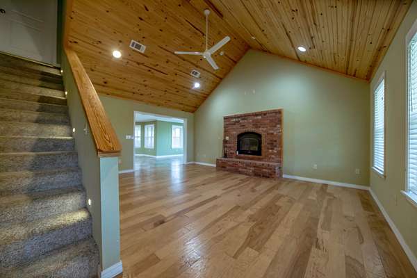 - 4 Bedrooms with like-new carpeting o 3 Full Bathrooms o Stunning vaulted wood-plank ceiling in the living room with beautiful hickory hardwood floors.