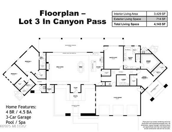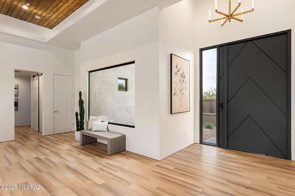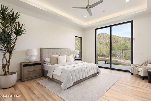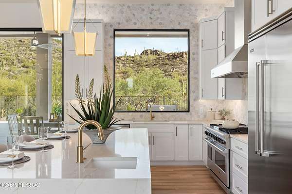 NOW COMPLETE! Welcome to the pinnacle of modern desert living in guard-gated Canyon Pass at Dove Mountain. This brand-new custom estate blends architectural drama with a refined livable open-concept on a stunning 1.62-acre private homesite with panoramic mountain views. Crafted for the luxury buyer, this 4-bedroom, 5-bath residence features soaring 14' ceilings, a chef's kitchen with Taj Mahal quartzite, Viking appliances, and a dramatic island for seamless entertaining. The great room, anchored by a linear fireplace and custom wood ceiling, flows effortlessly through expansive glass sliders to the covered patio, pool, and spa beyond, creating the ultimate indoor-outdoor connection. Seller will accept or counter offers between $3,000,000 and $3,250,000. The primary suite is a true retreat with private patio access, a spa-like bath, freestanding tub, oversized walk-in shower, and large custom closet. Two generous guest suites plus a versatile bedroom/office/den complete the thoughtful split floor plan. Additional features include wood plank flooring, designer lighting, oversized laundry, and a 3-car garage with storage.