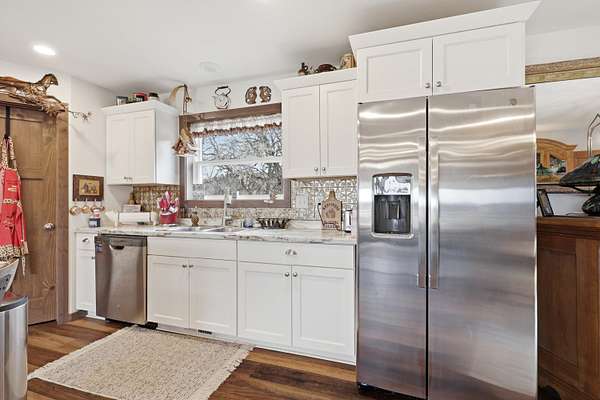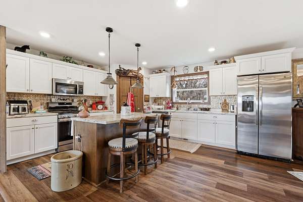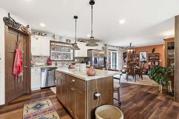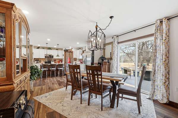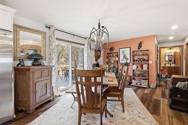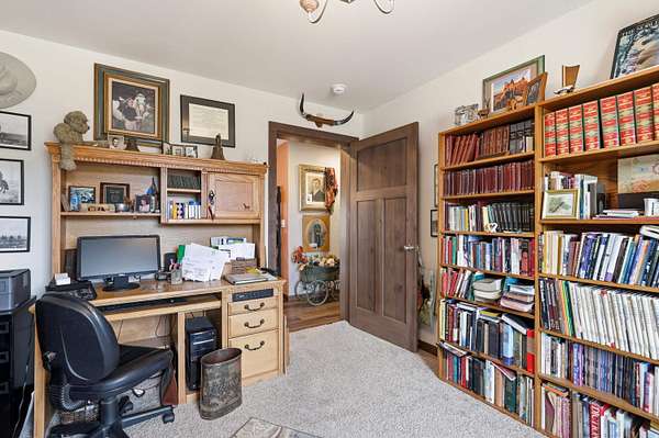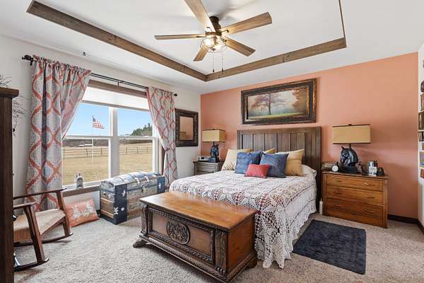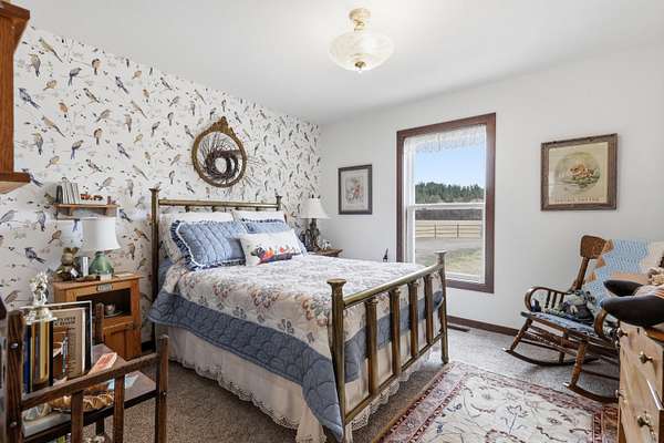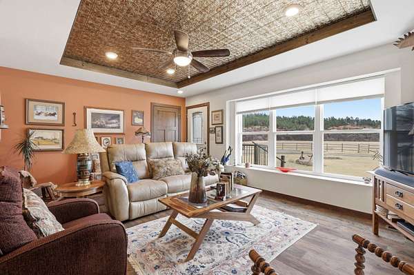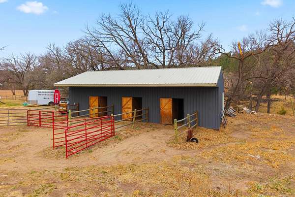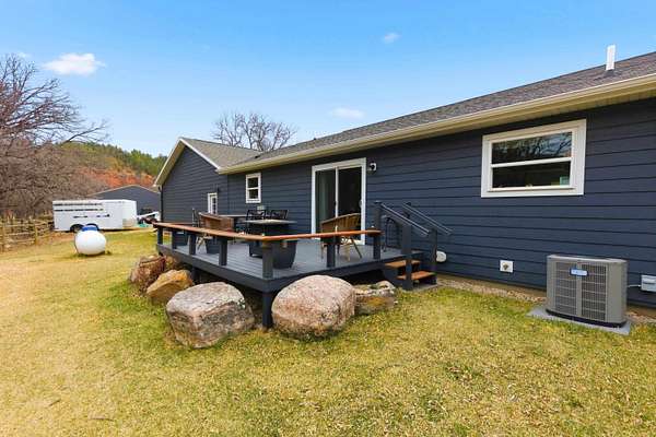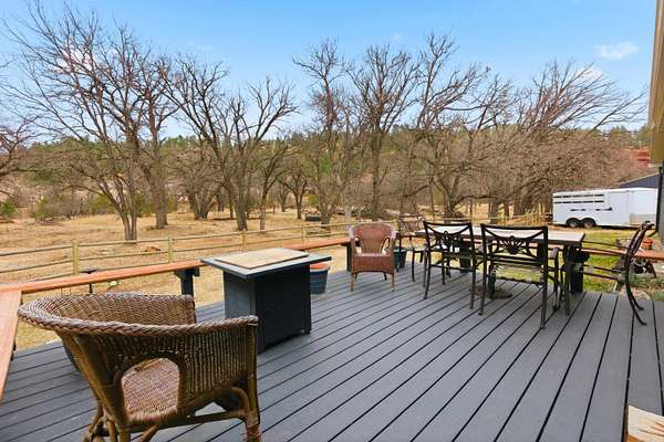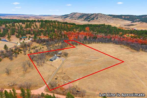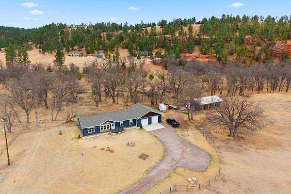 Horse property, NO covenants, blend of trees and open meadow with a view of the red rock cliffs....it's PERFECT! Set on beautiful 9.45 acres, with mature oak trees, this charming horse property offers a peaceful retreat with a year-round stream at the northern end. Equestrian ready with a 3-stall barn, the property is suited for horse owners, but anyone can enjoy this little slice of the Black Hills. The home is thoughtfully designed to take advantage of the view from both sides of the home. Tucked off the main road, it offers privacy combined with ease of travel, with a 10-minute drive to Hwy 79.