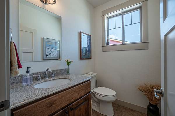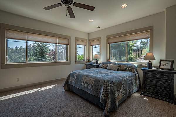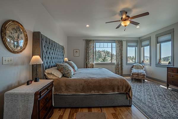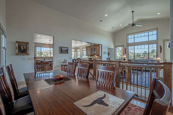 The two-level, four-bedroom home includes a main-level primary suite with dual bath fixtures and double walk-in closets. The open kitchen features rich wood cabinetry, granite countertops, a large sitting island, breakfast nook, and built-ins, flowing into the great room with a sandstone wood-burning fireplace. Vaulted ceilings and expansive windows open to a deck overlooking pastures where horses and wildlife gather. The dining area adjoins a covered grilling patio. The lower level offers three bedrooms, a living area, and a walk-out patio to a fenced, landscaped lawn.