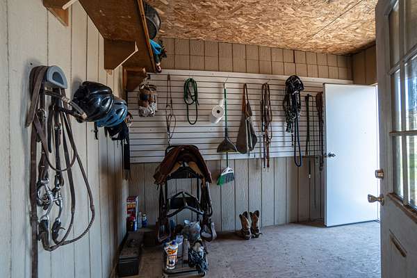 The property features a 1,728 sf Cleary barn designed for both functionality and durability. The structure includes four spacious horse stalls with wood lower panels and steel upper grills, a dirt floor for natural footing, and a enclosed tack room for gear storage. The barn is equipped with electrical power, supporting lighting and equipment use, and is topped with a metal roof and siding for low-maintenance longevity.