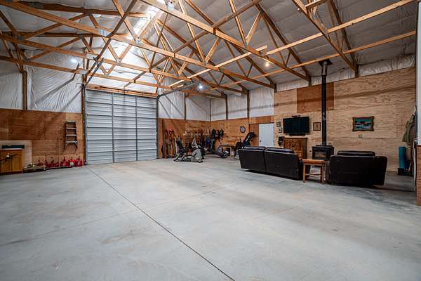 A 3,042 sf Cleary shop with living quarters and drive-through garage bays offers exceptional versatility with dual 12? x 12? overhead doors, a spacious workshop and a studio. The studio includes a kitchen area , stackable washer/dryer, and baseboard heating for year-round comfort. Inside, a large multi-purpose lounge area with a wood-burning stove provides the perfect spot for relaxing or entertaining. Durable metal construction, full concrete floors, and quality insulation make this space ideal for vehicle storage, projects, and comfortable living.