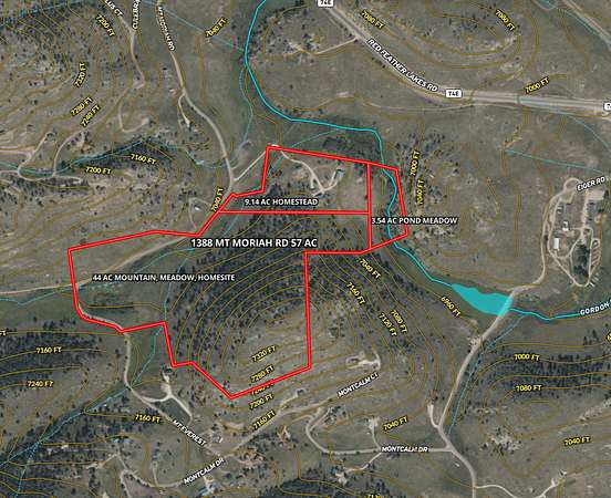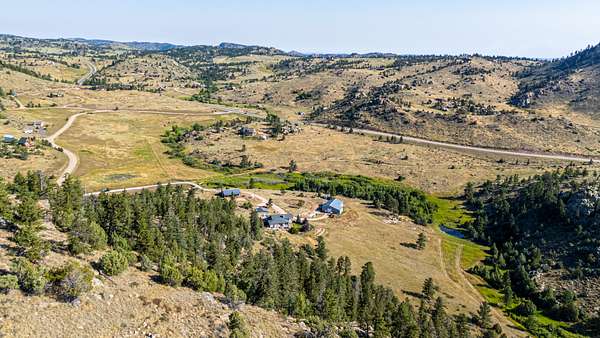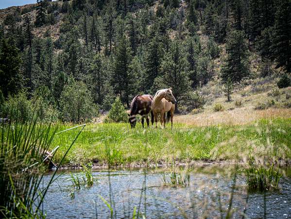 This distinctive property blends rich pasture, a naturally fed pond, Gordon creek, striking rock outcroppings, and a pine-covered mountain rising 360 feet above the homestead. Nestled in a sheltered mountain valley, it offers rolling meadows, rocky hillsides with scattered boulders, and a lush riparian zone fed by a natural drainage corridor. Mature ponderosa pine cover the slopes, while aspen, willows, and shrubs line the waterway. Open grasslands provide excellent grazing and, together with wooded cover and water, create a thriving habitat for abundant wildlife. Buildings sit on gently elevated terrain, capturing sweeping views of the valley and surrounding hills.