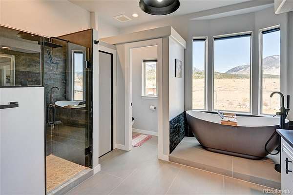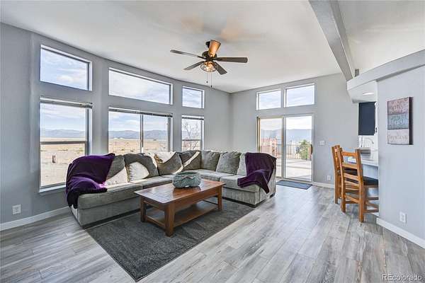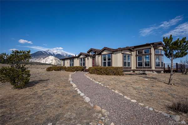 Fantastic horse property on just under 13 acres with truly unmatched views. This exceptional property allows up to three horses with outside watering and offers breathtaking panoramic views of both the Collegiate Peaks and the Chalk Cliffs. The home has been beautifully remodeled throughout, creating a bright and spacious open floor plan that feels both comfortable and inviting. The kitchen is thoughtfully designed with all stainless steel appliances, a delightful center island, and an eat-in kitchen, along with a separate dining area. The counter bar opens to the family room, making it ideal for the family and entertaining. Decorative touches such as coffered ceilings and planter shelves add character and charm. The family room features large picture windows that capture the Collegiate Peaks and Chalk Cliffs, along with an attractive rock-accent gas fireplace and welcoming foyer entry. The primary suite is generously sized and large walk in closet along with a cozy den just off the east side. The fully remodeled primary bathroom showcases a rock accent wall, deep soaking tub, spacious tile walk-in shower, toilet closet and comfortable in-floor heating. One other bedroom, an office and a ¾ bathroom, and a utility room with washer and dryer included provide great functionality. Outdoor living is just as enjoyable, with a composite deck off the kitchen on the north side, private dog run, and planter boxes on the west side. The property is fully set up and ready for horses, featuring a three stall barn, tack room, hay shed, two storage sheds, heated and lighted waterers and feeders, and a corral pen. A few aspen trees. Circle driveway and plenty of room for parking. If a person desires, they could add a nice size detached garage. This is hard to find as there's not much horse property out there. Serial Number of the Western Manufactured Homes, Model #MO-8 is: #17613352ABCP. Call now for private showing.