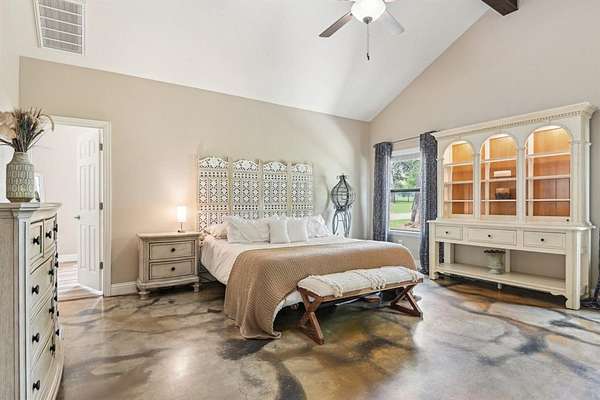 Inside, the 4-bedroom, 2.5-bath home features a spacious open-concept layout. Vaulted ceilings in the living room and primary bedroom create a sense of volume. Stained concrete floors offer durability and easy maintenance--especially pet-friendly. The large stone fireplace serves as a cozy centerpiece in the living space, and granite countertops complement the kitchen, which opens into the dining and family areas for easy entertaining.