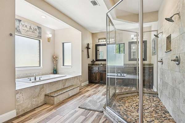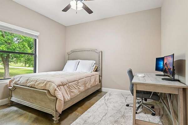 The oversized primary suite is set apart for privacy and includes a dual shower and generous space to unwind. Step out back to enjoy the covered patio shaded by established trees and cozy firespot, perfect for relaxing evenings under the stars.