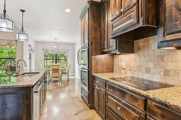 Inside, the 4-bedroom, 2.5-bath home features a spacious open-concept layout. Vaulted ceilings in the living room and primary bedroom create a sense of volume. Stained concrete floors offer durability and easy maintenance--especially pet-friendly. The large stone fireplace serves as a cozy centerpiece in the living space, and granite countertops complement the kitchen, which opens into the dining and family areas for easy entertaining.