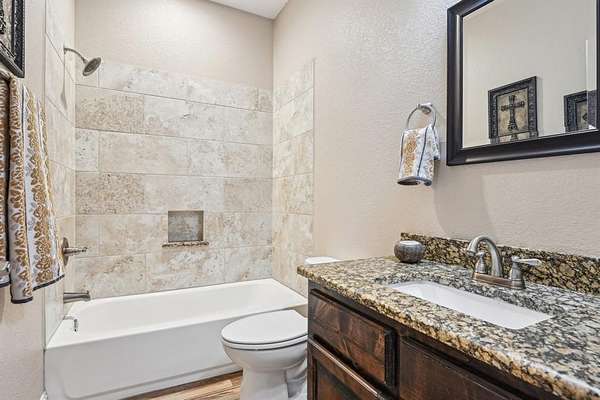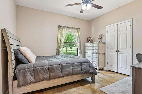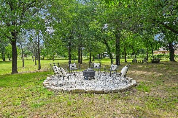 The oversized primary suite is set apart for privacy and includes a dual shower and generous space to unwind. Step out back to enjoy the covered patio shaded by established trees and cozy firespot, perfect for relaxing evenings under the stars.