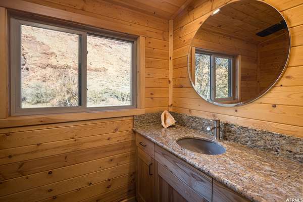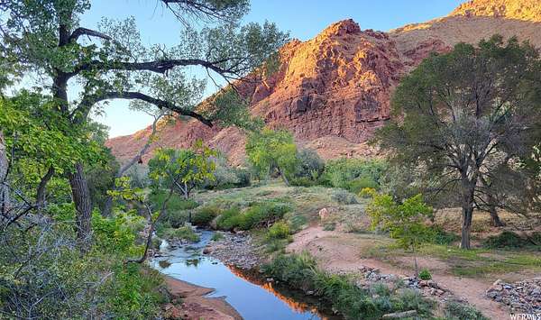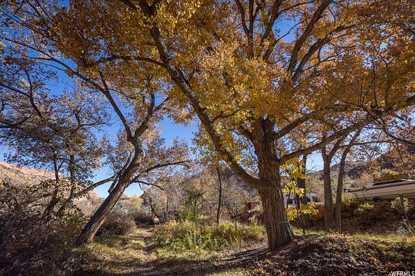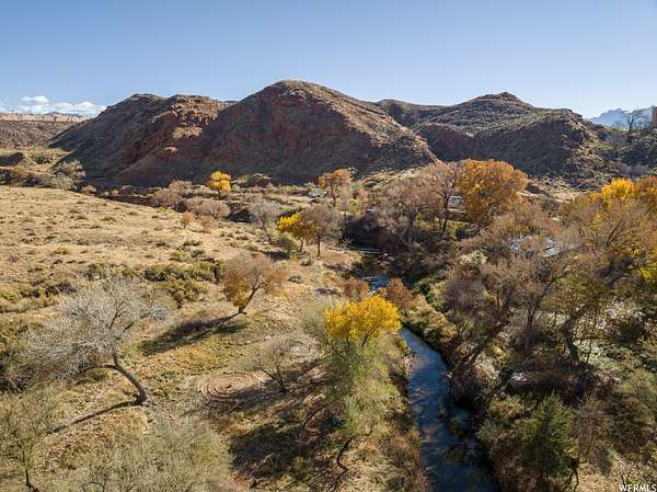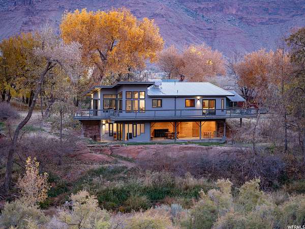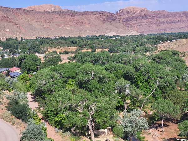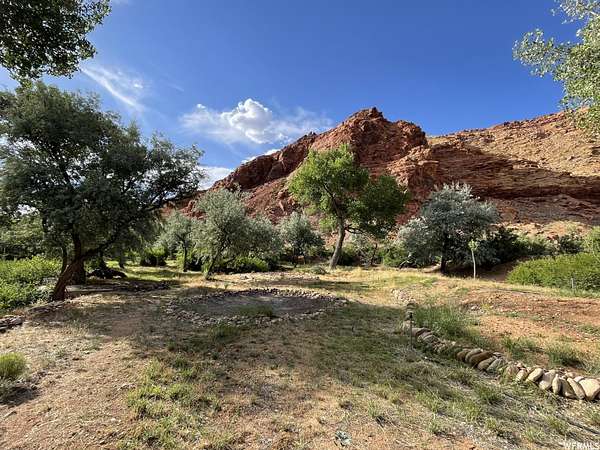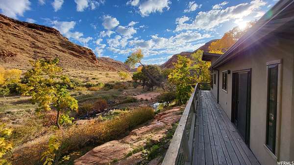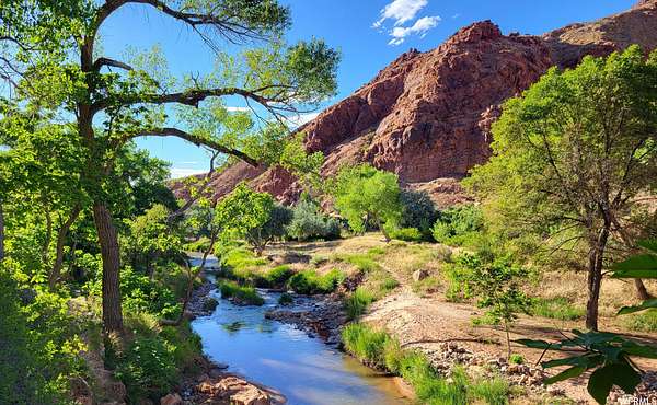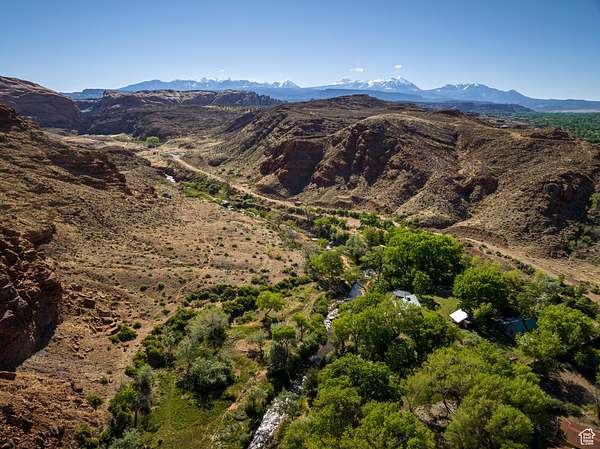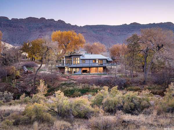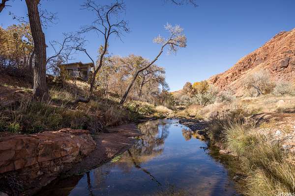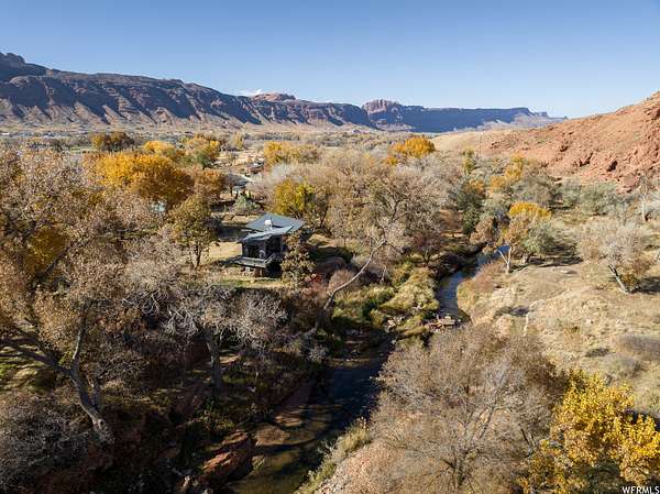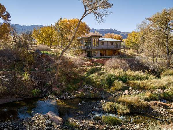 THE DESERT'S RIPARIAN SOUL- From the top of the La Sal Mountain range to these privately owned rugged red cliffs- your palette to explore the writing of the ancients and dream at the base of Moab's Sand Flats Recreation area- the home of Slickrock and other mountain bike trails that make Moab the Nation's Mountain biking mecca lies the Moab desert's crown jewel, Mill Creek. A year-round tributary of the Colorado river, this privately held section of Mill Creek with over 24 acres of land offers over one thousand feet of tranquil running water, under a canopy of seasonal colors from the mighty cottonwood trees, with direct access to the coveted Mill Creek Canyon and endless miles of federally protected hiking trails. A spring, with a deeded water right, flowing at over 60 gallons a minute is sourced and distributed throughout the irrigated portions of the property, supporting the old growth and new growth of indigenous trees and shrubs. Finished in 2021, a contemporary 2-bedroom, 1,200 square foot home on two levels with an infinity edge wrap around deck is anchored into the bedrock ledge directly above the creek and flowing spring water. The home features granite counter tops, floor to ceiling windows, knotty pine finish, natural slate tiled floors with luxurious radiant heating, and has been situated and designed for a larger expansion, should you desire. The extreme privacy will empower you to forget that the City center is only moments away and you are secluded, but not left without convenience. The land consists of four separate tax parcels all with access to all municipal services which allows for multiple options to build additional homes, enlarge either of the two existing homes, or expand your estate. The manicured riparian forest, with over 300 mature shade and fruit trees of 17 different species, hosts a lush habitat for birds and wildlife. The property also offers a charming farmhouse, perfect for your guests or a caretaker. The neighboring property of 7.95 acres and another 1,000 feet of Millcreek is also for sale, a phenomenal opportunity to extend this private oasis. Under the trees, within the harmony of the water, just 1 mile from Moab's city center, will allow you to live at the edge of the desert's riparian soul.