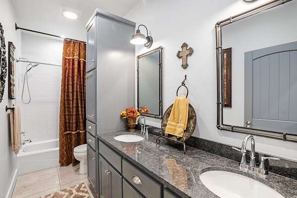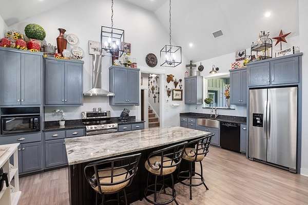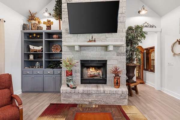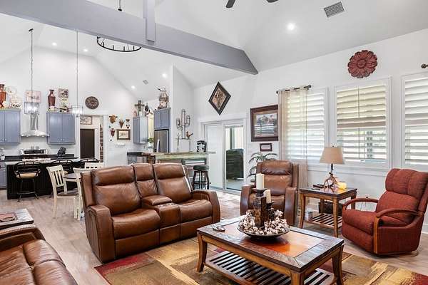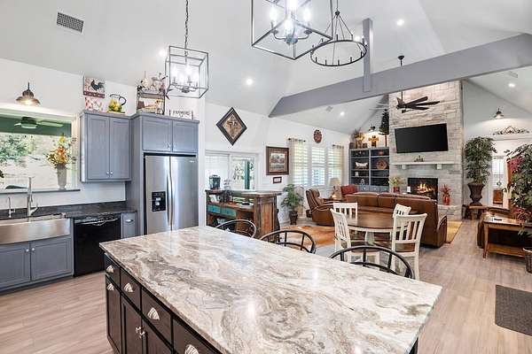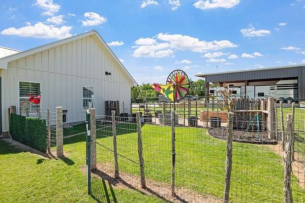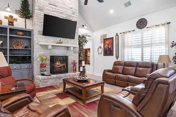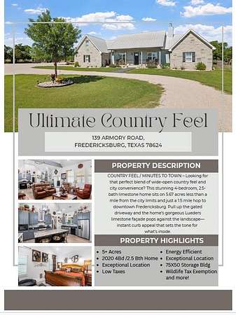 COUNTRY FEEL / MINUTES TO TOWN - Looking for that perfect blend of wide-open country feel and city convenience? This stunning 4-bedroom, 2.5-bath limestone home sits on 5.67 acres less than a mile from the city limits and just a 1.5 mile hop to downtown Fredericksburg. Pull up the gated driveway and the home's gorgeous Lueders limestone faade pops against the landscape--instant curb appeal that sets the tone for what's inside. Step inside and you are greeted by towering vaulted ceilings and a grandiose stone fireplace, along with super durable wood-look strand woven bamboo floors running through much of the home. The open/split floor plan creates an effortless flow with the kitchen, dining and living areas meshing together seamlessly. The kitchen is great for cooks and entertainers alike, with smart storage solutions, a massive island (seating included), and room for everyone to gather. The primary suite is a true retreat and offers a bright airy feel with tall vaulted ceilings and tons of natural light and its ensuite spa-like master bath will impress with his and her sinks, a beautiful walk in shower, big soaker tub and spacious closet. Great split floor plan with two guest bedrooms and a shared bath sit on the opposite side of the house for privacy, while a handy half bath is tucked near the oversized utility room and garage. Next, head upstairs and you'll find a flexible fourth bedroom--perfect for a home office, gym, craft space, or whatever your life needs next. There's even a walk-in attic with spray foam insulation to keep things cool and energy bills low. OUTSIDE - Step outside and you'll find the ultimate Hill Country setup. 5.67 acres offers gentle soils ideal for a few horses or 4H projects. The land is also currently under a wild life exemption making the taxes low. Need storage? everyone will find a use for the huge 75X50 covered building that fits an RV, car collection, or all your toys, with power hook-up in place. Plus, there is an enclosed storage room and heated/cooled office space - man cave, art studio, workshop, the options are endless. The entire property is fenced and includes a paved driveway to the house. You will be equally impressed with the lovely landscaping and lush yard that greets you, as well as, a wonderful fenced back yard for your 4 legged family members and a small pond in the back yard making for a relaxing afternoon of fishing. All this, and you're only five minutes from the heart of Fredericksburg. It's the best of both worlds--serene country life with town just down the road. Come see what makes this Hill Country home truly special.