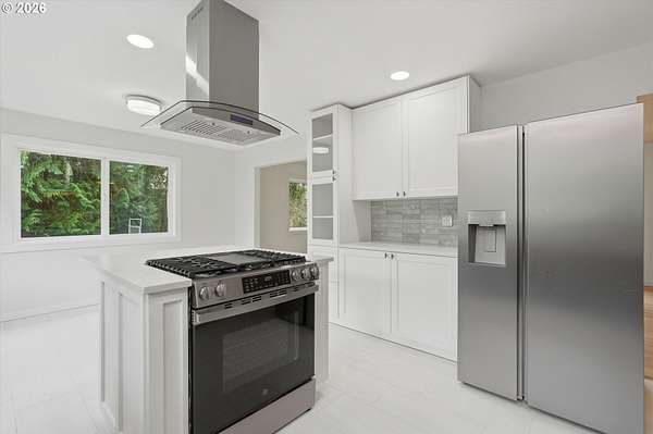 - Dishwasher, Disposal, Free Standing Gas Range, Free Standing Refrigerator, Solid Surface Countertop, Stainless Steel Appliance, Tile