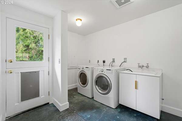 - Concrete Floor, Hardwood Floors, Laundry, Tile Floor, Washer Dryer