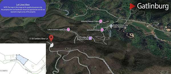 From Publix in Pigeon Forge, head southeast on Parkway/US-441 S for 2.3 miles, then turn right onto Wears Valley Rd (US-321) and continue for 10.6 miles. Turn left onto Happy Hollow Rd and drive 1.4 miles, then turn right onto S Clear Fork Rd. Follow S Clear Fork Rd for 2.8 miles, then turn left onto Chamberlain Ln. Continue for 0.5 miles before turning right onto Settlers View Ln. Drive 0.3 miles to arrive at 5130 Settlers View Ln. Lot 139E is right before 5130.
