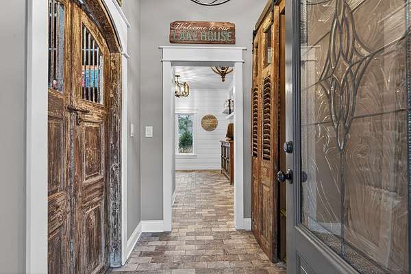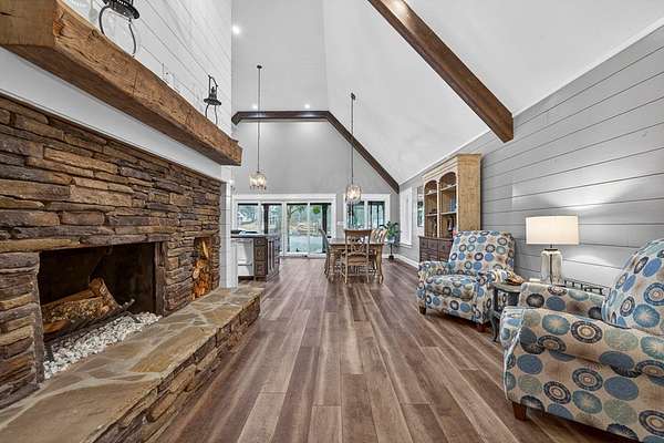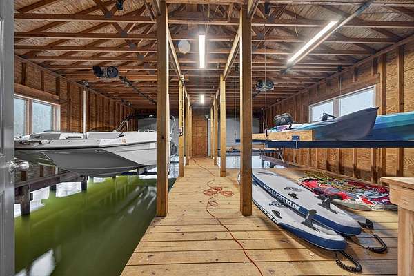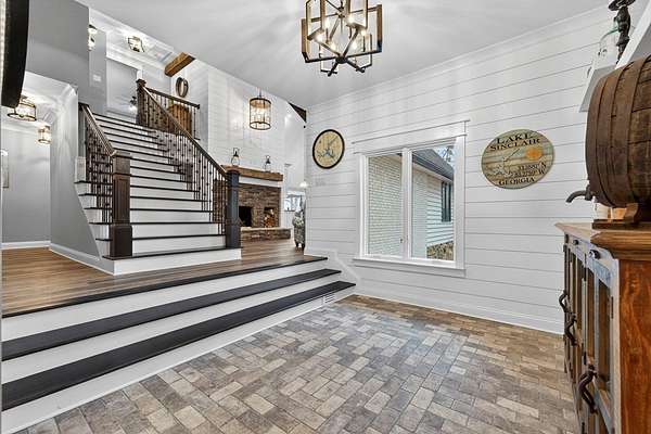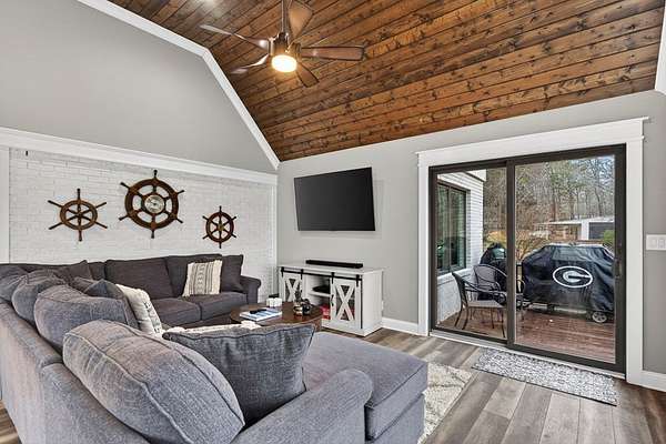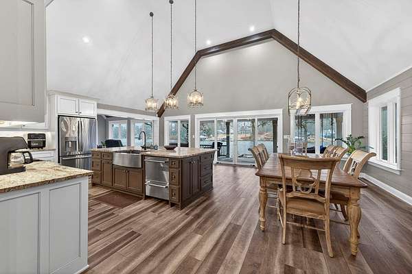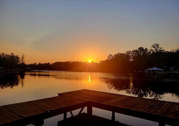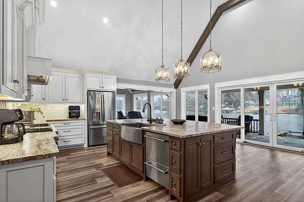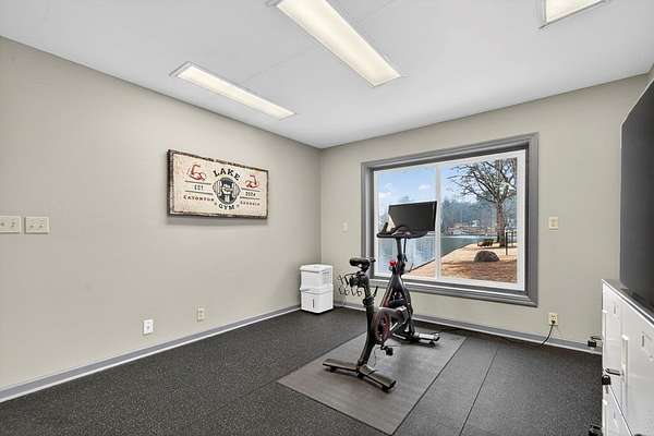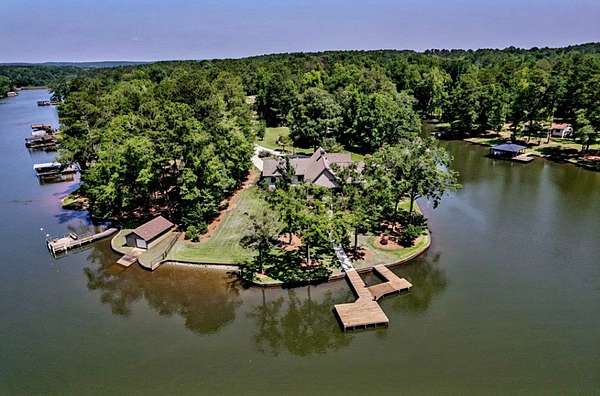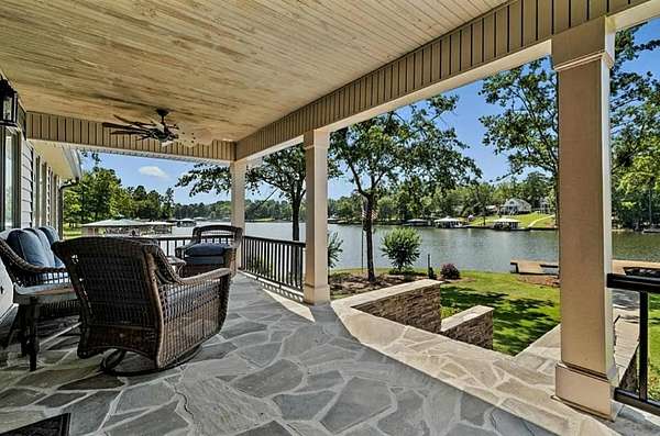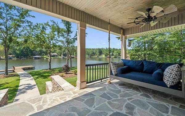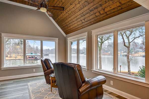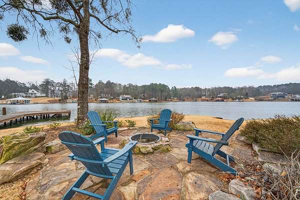 Exceptional lakefront living on a rare fee-simple point lot in the highly sought-after Crooked Creek area of Lake Sinclair. Surrounded by water on multiple sides, this stunning property offers approximately 431 feet of shoreline, deep water averaging 8+ feet, and a sandy beach area, creating the ultimate setting for year-round lake enjoyment. This beautifully appointed 4-bedroom, 3.5-bath home has recently received a striking exterior refresh and is enhanced by professionally designed luxury landscaping, delivering a refined, private, resort-like feel from the moment you arrive. A comprehensive renovation in 2019 included new plumbing, HVAC, roof, Pella windows and sliding doors, custom cabinetry, countertops, doors, trim, and premium finishes throughout. The gourmet kitchen anchors the main living space and features a 48-inch Wolf six-burner range with griddle and dual ovens, a Sharp microwave drawer, and high-end appliances, flowing seamlessly into spacious living and entertaining areas. The terrace level has been further improved with newly renovated ceilings, adding to the home's polished and updated appeal. Outdoor living is exceptional, with fenced front and back yards, gated entry, security system with cameras, irrigation system, and an enclosed double boathouse with an additional open dock. Right by the boathouse, a separate finished home gym provides a dedicated wellness space featuring a large picture window with tranquil lake views. A private boat ramp allows easy launching for family and guests. This is a rare opportunity to own a fully updated, meticulously